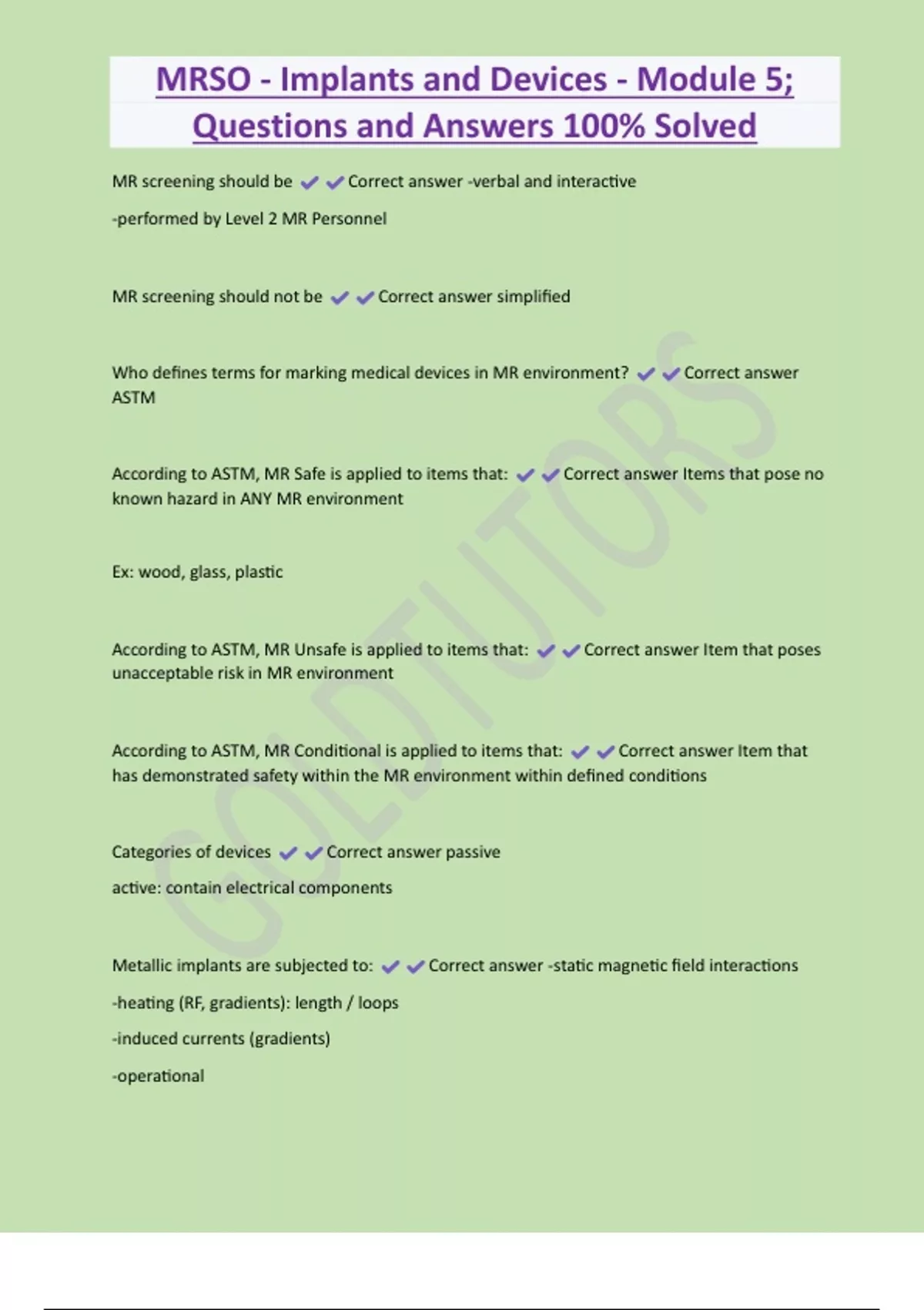 MRSO - Implants and Devices - Module 5; Questions and Answers 100% Solved MR screening should be Correct answer -verbal and interactive -performed by Level 2 MR Personnel MR screening should not be Correct answer simplified Who defines terms for marking medical devices in MR environment? Correct answer ASTM According to ASTM, MR Safe is applied to items that: Correct answer Items that pose no known hazard in ANY MR environment