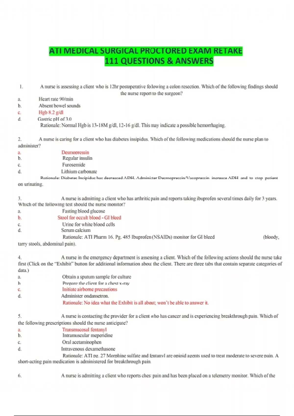 ATI Med-Surg practice test Stuvia Is Available For Download After Purchase. In Case You Encounter Any Difficulties With The Download, Please Feel Free To Reach Out To Me. I Will Promptly Send It To You Through Google Doc or Email. Thank You. ATI MEDICAL SURGICAL PROCTORED EXAM RETAKE 111 QUESTIONS & ANSWERS is crucial for your nursing exam preparation. This proctored nursing exam retake helps you master medical surgical concepts. With 111 questions and answers, it identifies your areas of improvement. Use this study aid to prepare for the ATI Med-Surg retake and boost your confidence. The ATI nursing retake exam ensures thorough understanding of key topics. Purchase the ATI Med-Surg practice test and enhance your exam readiness. This comprehensive resource is designed to aid your Med-Surg exam preparation effectively.