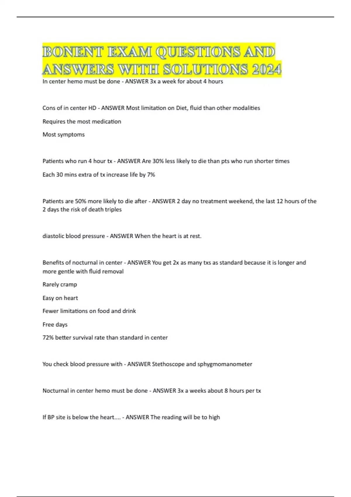 In center hemo must be done - ANSWER 3x a week for about 4 hours Cons of in center HD - ANSWER Most limitation on Diet, fluid than other modalities Requires the most medication Most symptoms Patients who run 4 hour tx - ANSWER Are 30% less likely to die than pts who run shorter times Each 30 mins extra of tx increase life by 7% Patients are 50% more likely to die after - ANSWER 2 day no treatment weekend, the last 12 hours of the 2 days the risk of death triples diastolic blood pressure - ANSWER When the heart is at rest. Benefits of nocturnal in center - ANSWER You get 2x as many txs as standard because it is longer and more gentle with fluid removal Rarely cramp Easy on heart Fewer limitations on food and drink Free days 72% better survival rate than standard in center You check blood pressure with - ANSWER Stethoscope and sphygmomanometer Nocturnal in center hemo must be done - ANSWER 3x a weeks about 8 hours per tx If BP site is below the heart.... - ANSWER The reading will be to high Benefits of nocturnal home hemo - ANSWER Better protein level Don't need binders No fluid limits Fewer symptoms Less heart damage Live as long as people who get a deceased kidney transplant If BP site is above the heart.... - ANSWER The reading will be to low Home hemo must be done - ANSWER 3x a week 4 -6 hours per tx Benefits of PD - ANSWER Can do alone at home or work Only need 1 -2weeks of training Allows for a more normal diet Allows pt to feel more normal peritonitis - ANSWER inflammation of the peritoneum, this can scar the peritoneum and make PD no longer possible, can be avoided by doing a sterile exchange 2 types of PD - ANSWER Continuous ambulatory peritoneal dialysis (CAPD) Automated peritoneal dialysis (APD) - uses cycled at night done 8 -10 hours during sleep During in center HD how much blood is outside of body at a time - ANSWER 1/2 cup Short Daily Home Hemodialysis must be done - ANSWER 5 -6days a week for the 2.5 -4 hour per tx a bp cuff that is too small or to loose will cause a - ANSWER Higher reading Nocturnal home hemomust be done - ANSWER At home 3 -7 nights a week 8 hours per tx A no cuff that is to big for a patients arm ... - ANSWER Lower reading Why would someone want to do more HD than standard? - ANSWER Longer or more frequent HD is gentle and cause fewer symptoms and may help Pt live longer, home puts pt in charge peritoneal dialysis - ANSWER the lining of the peritoneal cavity acts as the filter to remove waste from the blood through tiny blood vessels. Placed in abdomen and sometimes chest wall Dialysate sits in catheter for a few hours and excess water and waste flows from BV to the dialysate. The dialysate is then drained and replaced. (Exchange) Pt can use a cycle mahjne while they sleep Can also be done by hand 4xa day and can be done anywhere. In dialysis patients the reason BP drops during or close to the end of tx is because - ANSWER The total blood volume drops, from the water removal regular respiration rate - ANSWER 12 -16 breaths per minute In dialysis patients water may enter the lungs due to water weight gains this can cause - ANSWER Sob or trouble breathing Payment for dialysis - ANSWER Medicare pays for 80% of dialysis Medicare makes rules a clinic must follow to provide coverage of tax. Pt who don't have Medicare before CKD a pt must wait 3 months for it to cover in center but it will cover home -hemo right away. 2011 change how they pay for dialysis and created a "bundle" (composite rate, labs,drugs and home training) Quality Incentive Program - ANSWER Pay for performance, Cuts pay by 2% if measures aren't met. (Kt/v and hemoglobin) ESRD networks - ANSWER Oversees quality of care, 18 mostly nonprofit organizations. Renal physicians association(RPA) - ANSWER 1993 nephrologist made first clinical practice guidelines, including minimum dose of HD , when to start and stop HD and care for kidney disease for pt not on HD National Kidney Foundation (NKF) - ANSWER 1995, experts set guidelines for anemia, adequacy, and vascular access KDOQI - ANSWER Kidney Disease Outcomes Quality Initiative, improves care and outcomes of all people with kidney disease Dialysis Outcomes and Practice Pattern Study - DOPPS - ANSWER Help pts love longer by finding patterns incenter that can be changed to improve outcome state survey - ANSWER An inspection of the facility by state surveyors for compliance with rules and regulations of Medicare. If clinics don't follow they must make a plan of correction. Continuous Quality Improvement (CQI) - ANSWER Finding problems and fixing them. 4 step process 4 steps of continuous quality improvement - ANSWER 1.identify the problem - collect data and figure out how to fix 2.analyze problem -see if there is a standard or guideline to fix it, look at patterns or trends 3.cause of problem? 4.Plan,do,check,act - make a plan to fix, try plan, check results and make changes if needed Professionalism - ANSWER The quality of performing at a high level and conducting oneself with purpose and pride Boundaries - ANSWER Never share personal life or concerns with patients, never date pts, never borrow money, never invite to home or events, never except tips or money, do not sexually harass