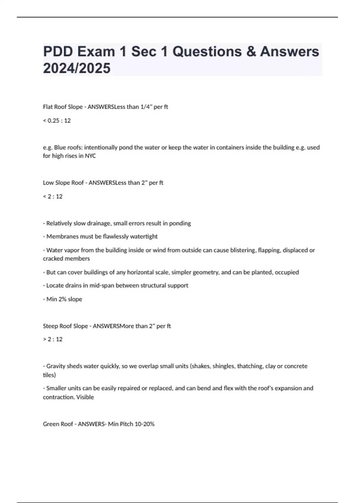 PDD Exam 1 Sec 1 Questions & Answers 2024/2025 Flat Roof Slope - ANSWERSLess than 1/4" per ft < 0.25 : 12 e.g. Blue roofs: intentionally pond the water or keep the water in containers inside the building e.g. used for high rises in NYC Low Slope Roof - ANSWERSLess than 2" per ft < 2 : 12 - Relatively slow drainage, small errors result in ponding - Membranes must be flawlessly watertight - Water vapor from the building inside or wind from outside can cause blistering, flapping, displaced or cracked members - But can cover buildings of any horizontal scale, simpler geometry, and can be planted, occupied - Locate drains in mid-span between structural support - Min 2% slope Steep Roof Slope - ANSWERSMore than 2" per ft > 2 : 12 - Gravity sheds water quickly, so we overlap small units (shakes, shingles, thatching, clay or concrete tiles) - Smaller units can be easily repaired or replaced, and can bend and flex with the roof's expansion and contraction. Visible Green Roof - ANSWERS- Min Pitch 10-20%