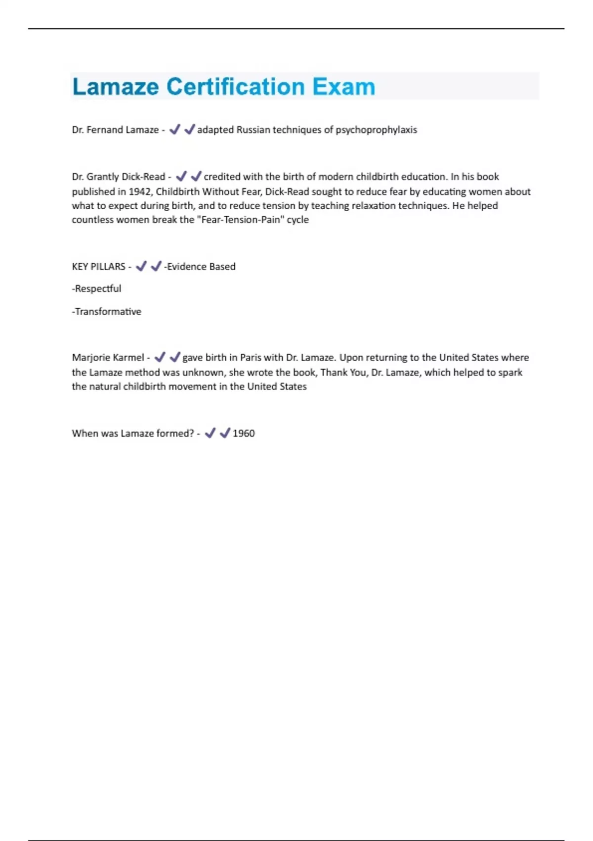 Dr. Fernand Lamaze - adapted Russian techniques of psychoprophylaxis Dr. Grantly Dick-Read - credited with the birth of modern childbirth education. In his book published in 1942, Childbirth Without Fear, Dick-Read sought to reduce fear by educating women about what to expect during birth, and to reduce tension by teaching relaxation techniques. He helped countless women break the "Fear-Tension-Pain" cycle KEY PILLARS - -Evidence Based -Respectful -Transformative Marjorie Karmel - gave birth in Paris with Dr. Lamaze. Upon returning to the United States where the Lamaze method was unknown, she wrote the book, Thank You, Dr. Lamaze, which helped to spark the natural childbirth movement in the United States When was Lamaze formed? - 1960