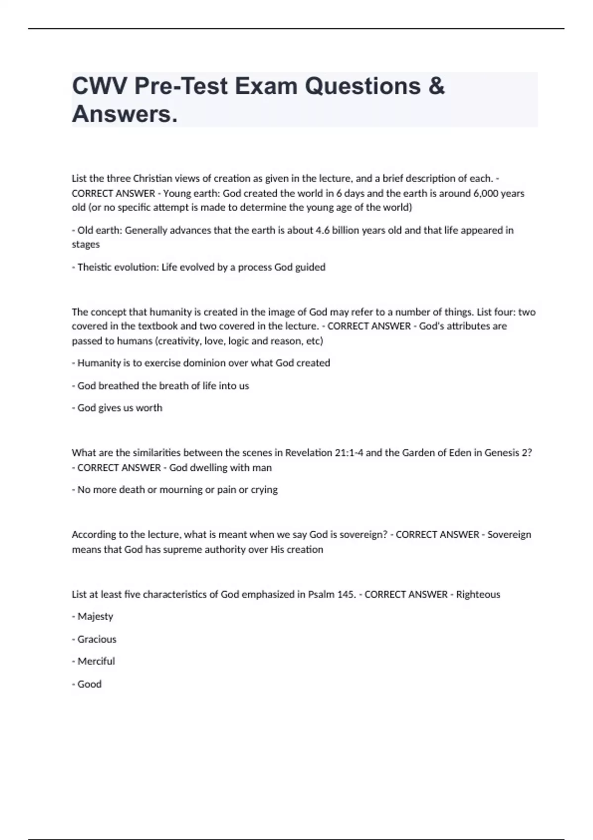 CWV Pre-Test Exam Questions & Answers. List the three Christian views of creation as given in the lecture, and a brief description of each. - CORRECT ANSWER - Young earth: God created the world in 6 days and the earth is around 6,000 years old (or no specific attempt is made to determine the young age of the world) - Old earth: Generally advances that the earth is about 4.6 billion years old and that life appeared in stages - Theistic evolution: Life evolved by a process God guided The concept that humanity is created in the image of God may refer to a number of things. List four: two covered in the textbook and two covered in the lecture. - CORRECT ANSWER - God's attributes are passed to humans (creativity, love, logic and reason, etc) - Humanity is to exercise dominion over what God created - God breathed the breath of life into us - God gives us worth What are the similarities between the scenes in Revelation 21:1-4 and the Garden of Eden in Genesis 2? - CORRECT ANSWER - God dwelling with man - No more death or mourning or pain or crying