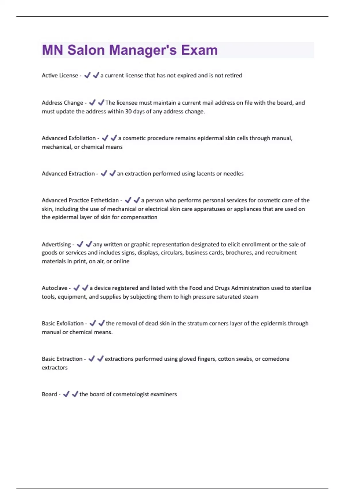 Active License - a current license that has not expired and is not retired Address Change - The licensee must maintain a current mail address on file with the board, and must update the address within 30 days of any address change. Advanced Exfoliation - a cosmetic procedure remains epidermal skin cells through manual, mechanical, or chemical means Advanced Extraction - an extraction performed using lacents or needles Advanced Practice Esthetician - a person who performs personal services for cosmetic care of the skin, including the use of mechanical or electrical skin care apparatuses or appliances that are used on the epidermal layer of skin for compensation Advertising - any written or graphic representation designated to elicit enrollment or the sale of goods or services and includes signs, displays, circulars, business cards, brochures, and recruitment materials in print, on air, or online Autoclave - a device registered and listed with the Food and Drugs Administration used to sterilize tools, equipment, and supplies by subjecting them to high pressure saturated steam Basic Exfoliation - the removal of dead skin in the stratum corners layer of the epidermis through manual or chemical means. Basic Extraction - extractions performed using gloved fingers, cotton swabs, or comedone extractors Board - the board of cosmetologist examinersChange of Name - Within 30 days of any legal name change, licensee must provide legal documentation of the name change and pay any fee required. The former name is invalid on the 31st day of the new legal name Change of Salon Owner - - A salon license must not be transferred when the salon is sold, or when a corporation owning a salon is sold. -If the license has not expired, the new owner has 60 days after the date of the change of ownership to become licensed. -If new license has not been issued by day 61, salon must cease all operations until a license is issued. - If the salon license is expired at the time of the change ownership, the new owner may not operate the salon until the salon is licensed Chemical Peel - Chemical exfoliation achieved by applying nonprescription chemical solutions or products Clean - free from all soil, dirt, and debris, and washed with soap and water, or a cleaning agent, and rinsed Compensation - a monetary or nonmonetary remuneration for services Continuing Education Requirements for Practitioners - Complete a total of 8 hours of CE credits from the board-approved providers within 3 years prior date to license renewal. Licensee must maintain proof of CE completion credits. The 8 hours must include: - 4 core hours of: 1 hour pertaining to state laws and rules, 3 hours related to health, safety, and infection control matters - 4 hours of professional practice CE, consisting of one or more of the following topics: chemistry, proper use of machines & instruments, business management, professional ethics, and human relations- an eyelash tech renewing must complete a total of 4 hours of core CE consisting 1 hour of state cosmetology laws and rules and 3 hours of health, safety, and infection control matters from boardapproved providers within the 3 years prior to license renewal. - The CE credits are valid for only one license renewal period, but may be applied to multiple licenses held by the same practitioner if the CE are completed within 3 years prior to license renewal date Cosmetologist - a person who performs personal beauty services for compensation Cosmetology - the practice of personal services, for compensation, for the cosmetic care of hair, nails, and skin. Designated Licensed Salon Manager - a manager designated by a salon owner and registered with the board, who is responsible with the salon owner for salon and practitioner compliance Designated School Manager - A school manager who is designated by the school owner and registered with the board, who is responsible with the school owner for school and instructor compliance Disinfect - the use of antimicrobial pesticide that eliminates harmful bacteria, fungi, and viruses on nonporous surfaces Disinfectant - an antimicrobial pesticide that is registered with the Environment Protection Agency for use in a hospital setting and is a bactericide, virucide, and fungicide Disinfectants - - only hospital-level EPA-registered disinfectemants are labeled as bactericidal, virucidal, and fungicidal - items must be cleaned first before disinfecting it- disinfectants must be used according to manufacturer's directions, including contact time, safety precautions, dilution requirements if any, and proper disposal - must be disposed immediately if visible debris is present - must be made daily and disposed at the end of day - items, tools or implements must be fully submerged in disinfectant in a covered container - licensees must wear gloves or use tongs to avoid direct skin contact with disinfectant Disinfecting - All surfaces of a tool pr implement, including handles, must be disinfected by a fully submerging the item in disinfectant in a covered container for the full contact time listed in the manufacturer's directions. Display of License - the practitioner must conspicuously post an original, unaltered, and current license at each salon where the practitioner practices. - either the license or the full name of the licensee as shown on the license must be posted at each workstation in the salon used by the licensee. Name tags worn by the licensee or business cards prominently displayed at the workstation meet this requirement if the full name is shown on the license is used. - Whenever the license is not posted at the workstation, the practitioner must post a license at the reception area or at each customer entrance of the salon - Copies of license do not meet the requirements of the license posting. Licensee must obtain duplicate licenses from the board in order order post licenses at multiple workstations or multiple salons. After a license is issued by the board, a print