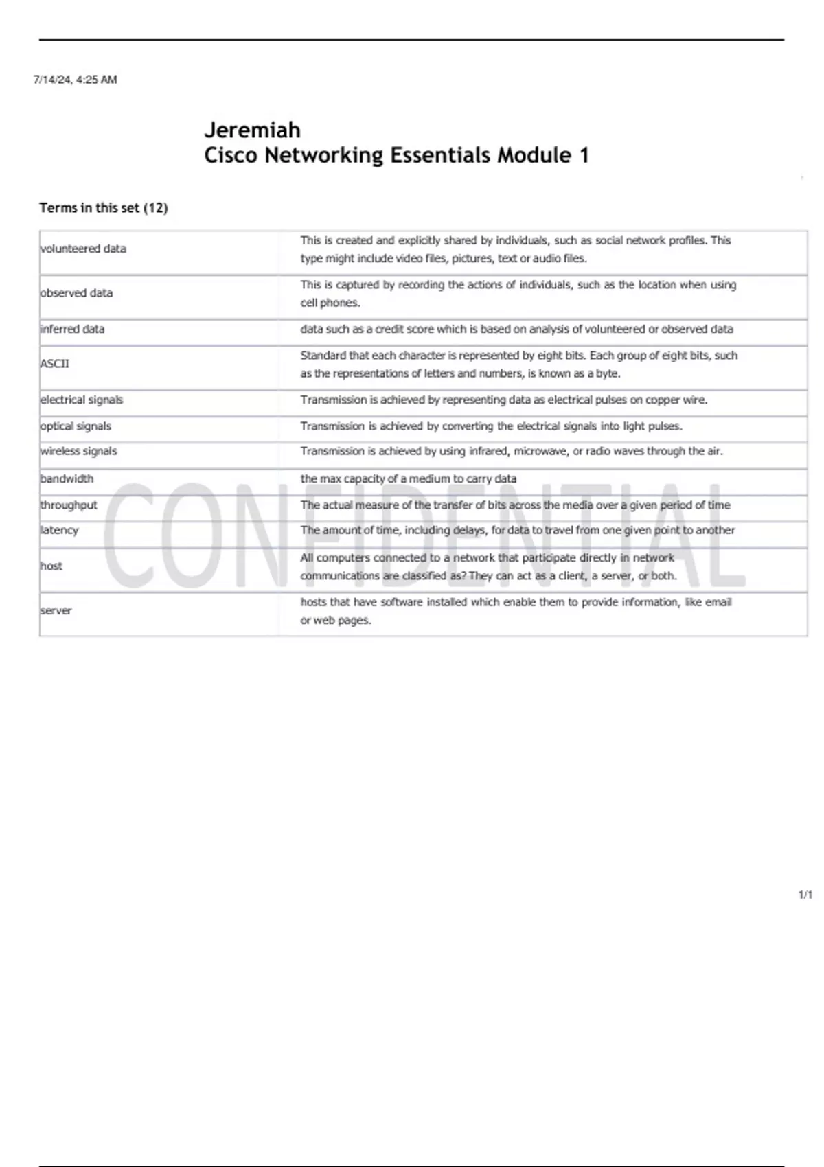 Cisco Networking Essentials Module 1 Terms in this set (12) volunteered data This is created and explicitly shared by individuals, such as social network profiles. This type might include video files, pictures, text or audio files. observed data This is captured by recording the actions of individuals, such as the location when using cell phones. inferred data data such as a credit score which is based on analysis of volunteered or observed data ASCII Standard that each character is represented by eight bits. Each group of eight bits, such as the representations of letters and numbers, is known as a byte. electrical signals Transmission is achieved by representing data as electrical pulses on copper wire. optical signals Transmission is achieved by converting the electrical signals into light pulses. wireless signals Transmission is achieved by using infrared, microwave, or radio waves through the air. bandwidth the max capacity of a medium to carry data throughput The actual measure of the transfer of bits across the media over a given period of time latency The amount of time, including delays, for data to travel from one given point to another host All computers connected to a network that participate directly in network communications are classified as? They can act as a client, a server, or both. server hosts that have software installed which enable them to provide information, like email or web pages.