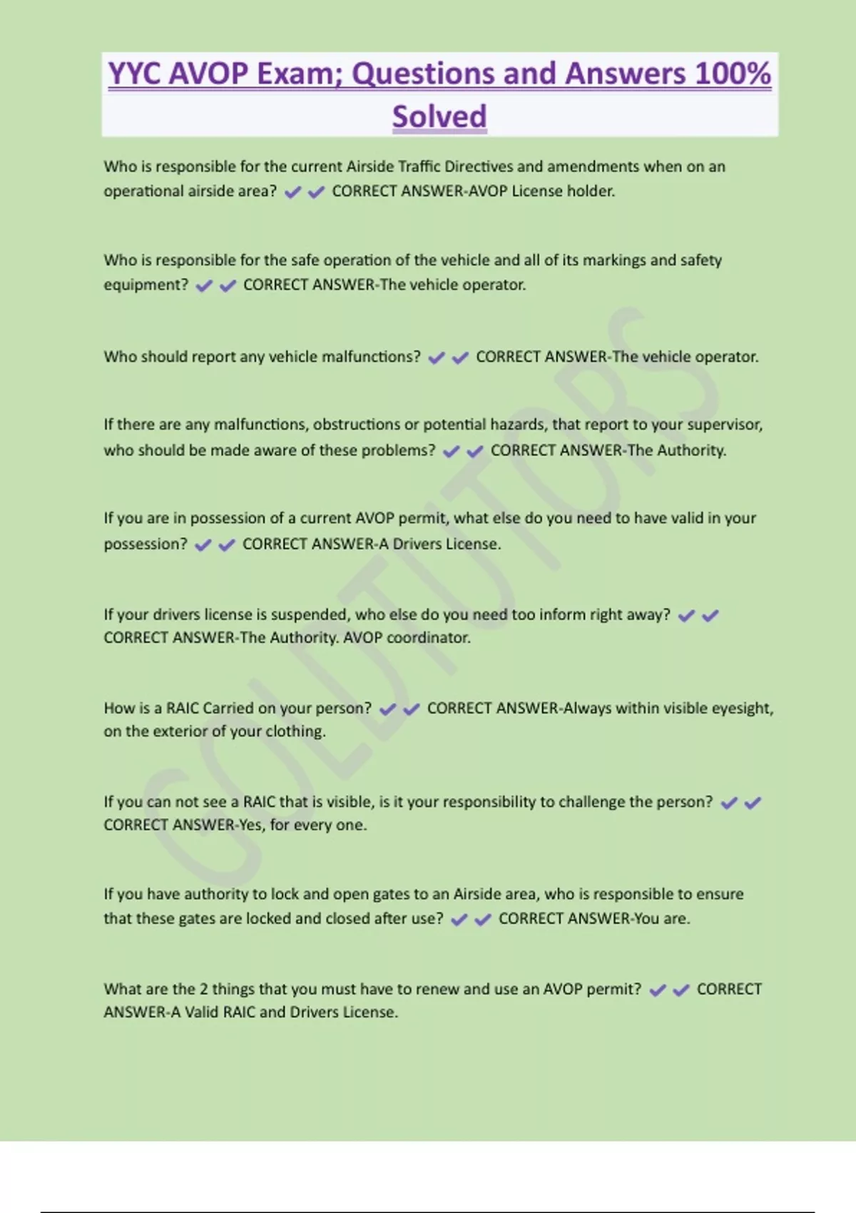 YYC AVOP Exam; Questions and Answers 100% Solved Who is responsible for the current Airside Traffic Directives and amendments when on an operational airside area? CORRECT ANSWER-AVOP License holder. Who is responsible for the safe operation of the vehicle and all of its markings and safety equipment? CORRECT ANSWER-The vehicle operator. Who should report any vehicle malfunctions? CORRECT ANSWER-The vehicle operator. If there are any malfunctions, obstructions or potential hazards, that report to your supervisor, who should be made aware of these problems? CORRECT ANSWER-The Authority