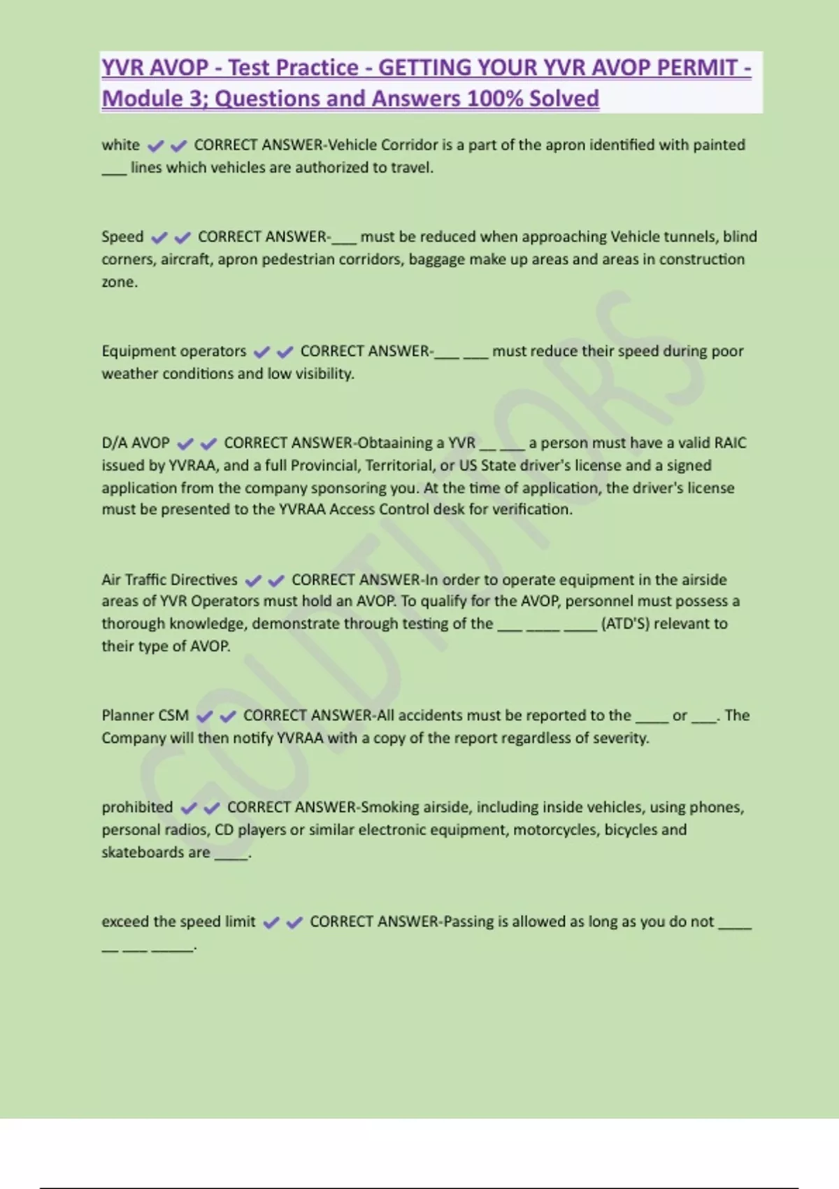 YVR AVOP - Test Practice - GETTING YOUR YVR AVOP PERMIT - Module 3; Questions and Answers 100% Solved