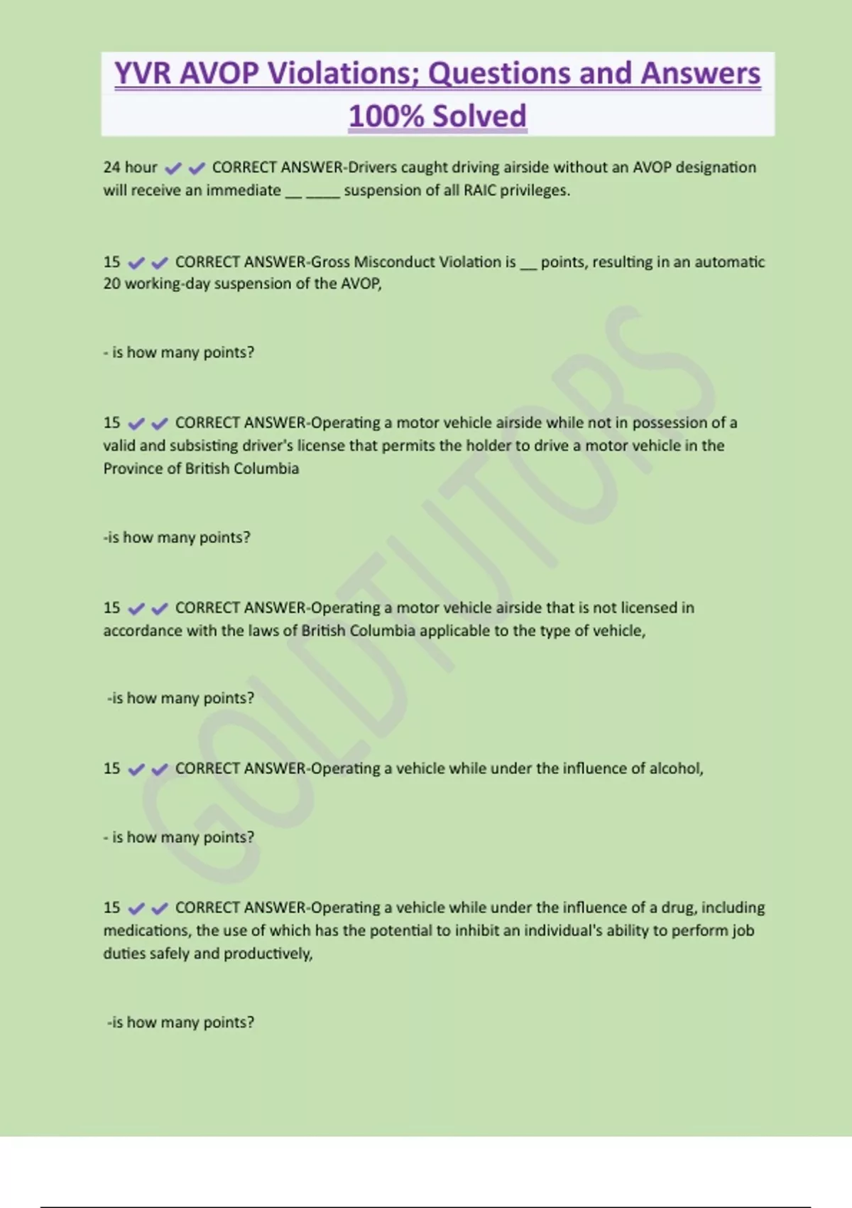 YVR AVOP Violations; Questions and Answers 100% Solved