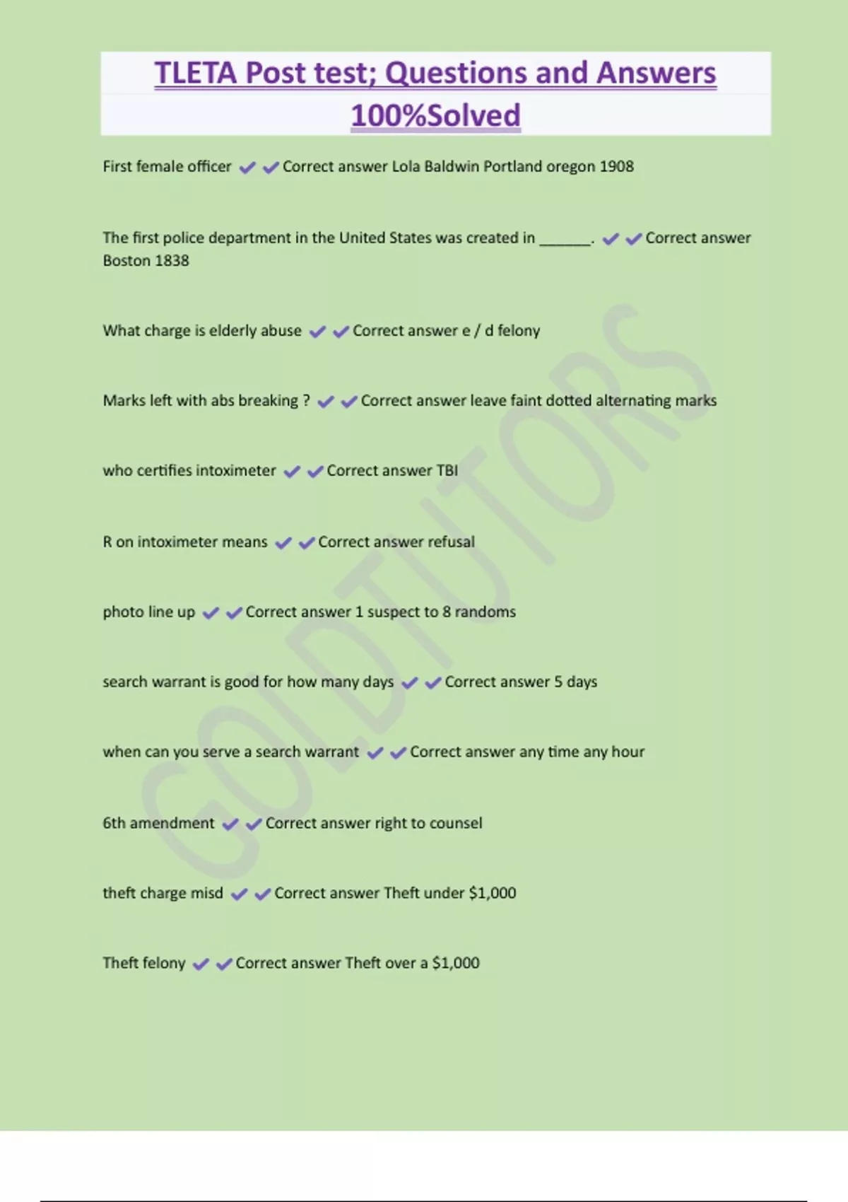 TLETA Post test; Questions and Answers 100%Solved First female officer Correct answer Lola Baldwin Portland oregon 1908 The first police department in the United States was created in ______. Correct answer Boston 1838 What charge is elderly abuse Correct answer e / d felony Marks left with abs breaking ? Correct answer leave faint dotted alternating marks who certifies intoximeter Correct answer TBI R on intoximeter means Correct answer refusal