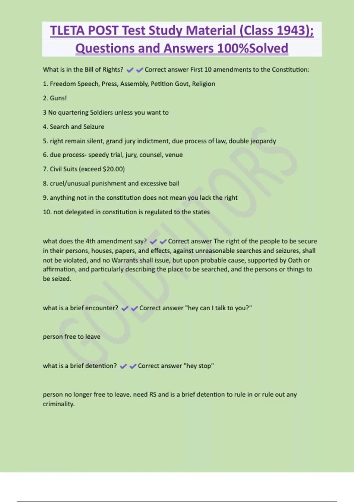 TLETA POST Test Study Material (Class 1943); Questions and Answers 100%Solved What is in the Bill of Rights? Correct answer First 10 amendments to the Constitution: 1. Freedom Speech, Press, Assembly, Petition Govt, Religion 2. Guns! 3 No quartering Soldiers unless you want to 4. Search and Seizure 5. right remain silent, grand jury indictment, due process of law, double jeopardy 6. due process- speedy trial, jury, counsel, venue 7. Civil Suits (exceed $20.00) 8. cruel/unusual punishment and excessive bail 9. anything not in the constitution does not mean you lack the right 10. not delegated in constitution is regulated to the states