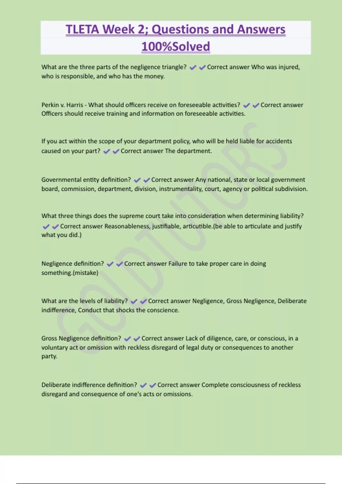 TLETA Week 2; Questions and Answers 100%Solved What are the three parts of the negligence triangle? Correct answer Who was injured, who is responsible, and who has the money. Perkin v. Harris - What should officers receive on foreseeable activities? Correct answer Officers should receive training and information on foreseeable activities. If you act within the scope of your department policy, who will be held liable for accidents caused on your part? Correct answer The department