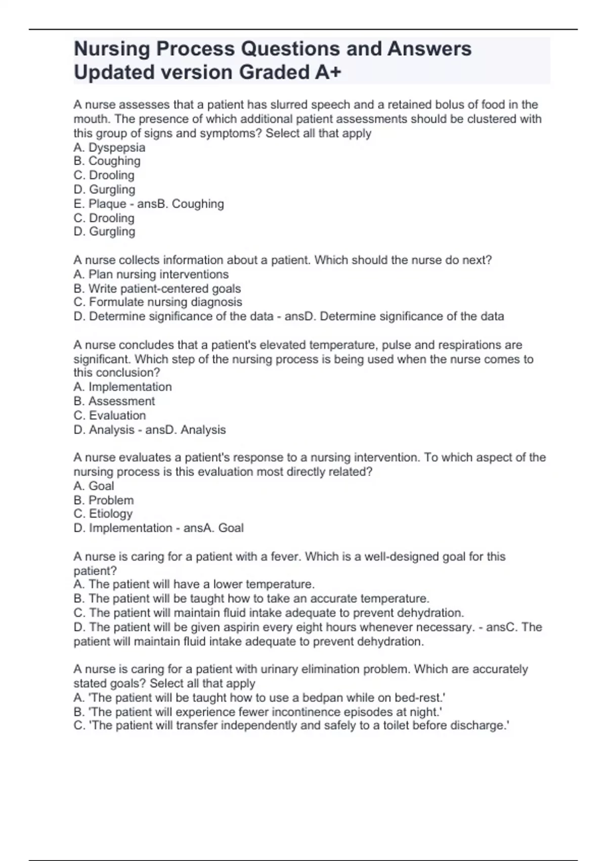 A nurse assesses that a patient has slurred speech and a retained bolus of food in the