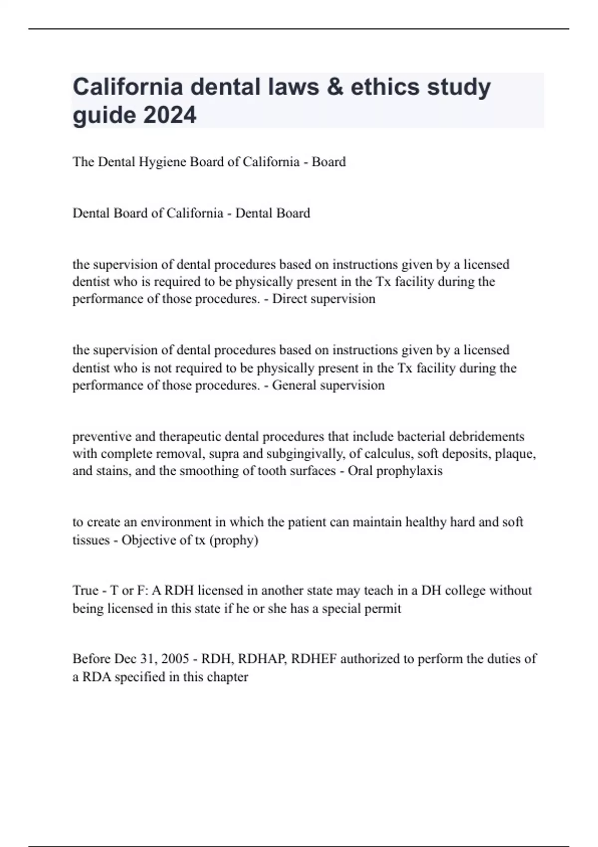 The Dental Hygiene Board of California - Board Dental Board of California - Dental Board the supervision of dental procedures based on instructions given by a licensed dentist who is required to be physically present in the Tx facility during the performance of those procedures. - Direct supervision the supervision of dental procedures based on instructions given by a licensed dentist who is not required to be physically present in the Tx facility during the performance of those procedures. - General supervision preventive and therapeutic dental procedures that include bacterial debridements with complete removal, supra and subgingivally, of calculus, soft deposits, plaque, and stains, and the smoothing of tooth surfaces - Oral prophylaxis to create an environment in which the patient can maintain healthy hard and soft tissues - Objective of tx (prophy) True - T or F: A RDH licensed in another state may teach in a DH college without being licensed in this state if he or she has a special permit Before Dec 31, 2005 - RDH, RDHAP, RDHEF authorized to perform the duties of a RDA specified in this chapter on & after Jan 1, 2006 - RDH, RDHAP, RDHEF shall qualify for and receive a RDA license prior to performance of the duties of a RDA specified in this chapter DH assessment, development, planning, and implementation of a DH care plan oral health education, counseling, and health screenings - RDH functions 1) Diagnosis and comprehensive treatment planning. 2) Placing, condensing, carving, or removal of permanent restorations. 3) Surgery or cutting on hard and soft tissue including, but not limited to, the removal of teeth and the cutting and suturing of soft tissue. 4) Prescribing medication. 5) Administering local/general anesthesia, oral/parenteral conscious sedation, except for the administration of nitrous oxide and oxygen, whether administered alone or in combination with each other, or local anesthesia pursuant to Section 1909. - The practice of dental hygiene does not include any of the following procedures: 1) Soft-tissue curettage. 2) Administration of local anesthesia. 3) Administration of nitrous oxide and oxygen, whether administered alone or in combination with each other. - RDH Functions under DIRECT Supervision 1) Preventive and therapeutic interventions, including oral prophylaxis, scaling, and root planing. 2) Application of topical, therapeutic, and subgingival agents used for the control of caries and periodontal disease. 3) The taking of impressions for bleaching trays and application and activation of agents with non-laser, light-curing devices. 4) The taking of impressions for bleaching trays and placements of in-office, tooth-whitening devices. - RDH Functions under GENERAL Supervision Educational services, oral health training programs, and oral health screenings b. Refer any screened patients with possible oral abnormalities to a dentist for a comprehensive exam, diagnosis, and Tx plan.