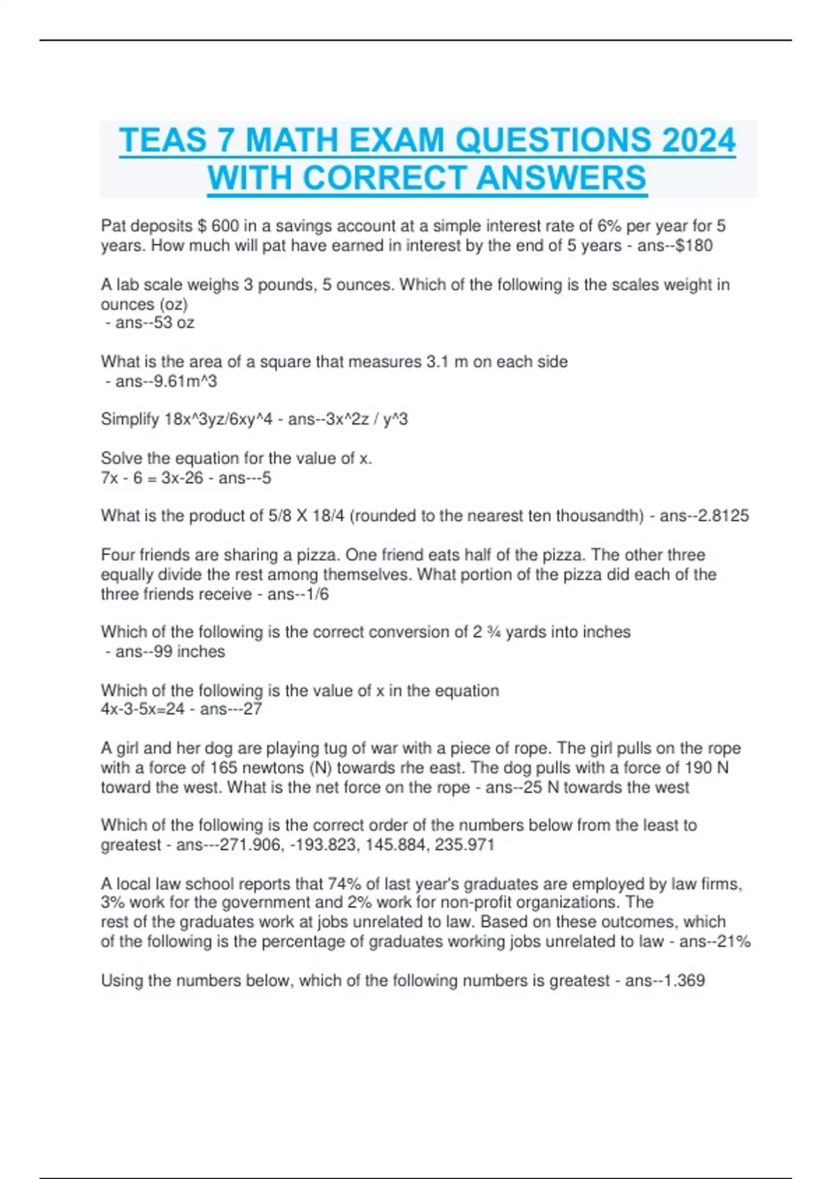 TEAS 7 MATH EXAM QUESTIONS 2024 WITH CORRECT ANSWERS