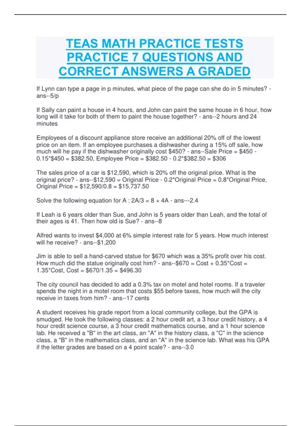 TEAS MATH PRACTICE TESTS PRACTICE 7 QUESTIONS AND CORRECT ANSWERS A GRADED