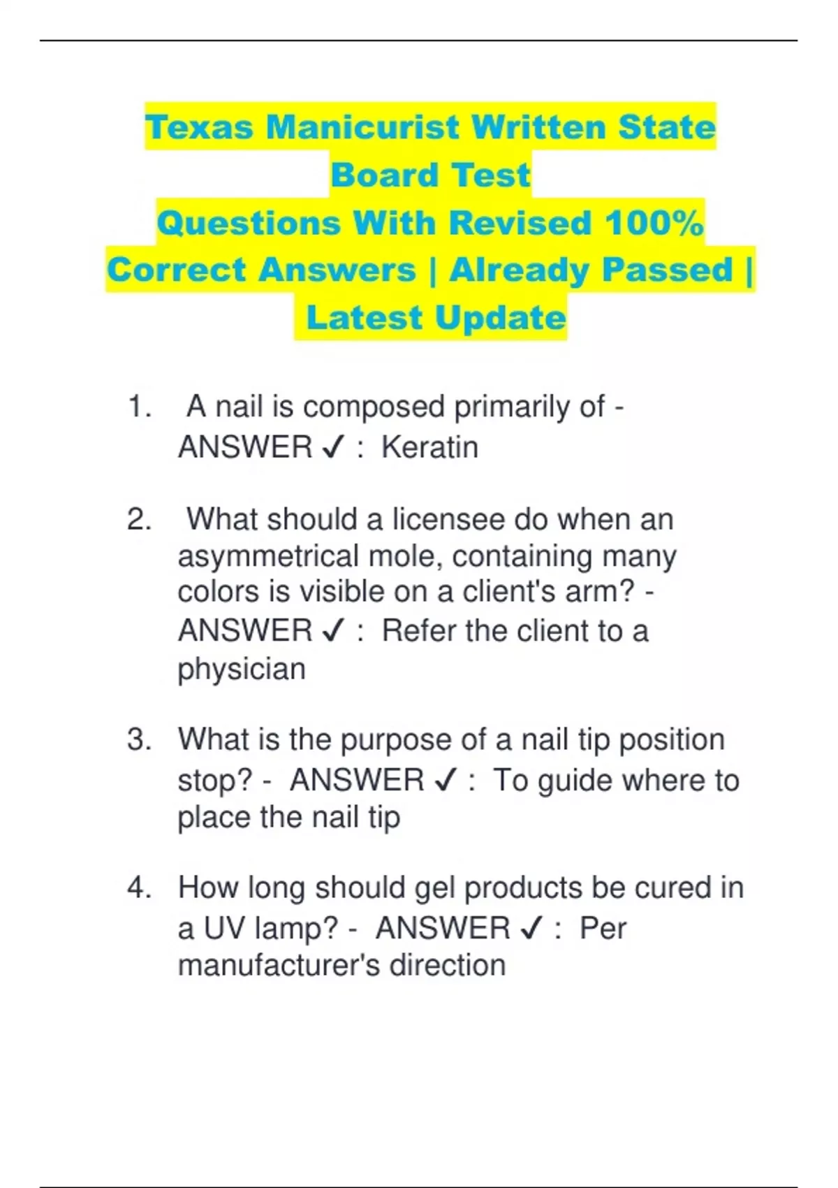 Texas Manicurist Written State Board Test Questions With Revised 100% Correct Answers | Already Passed | Latest Update