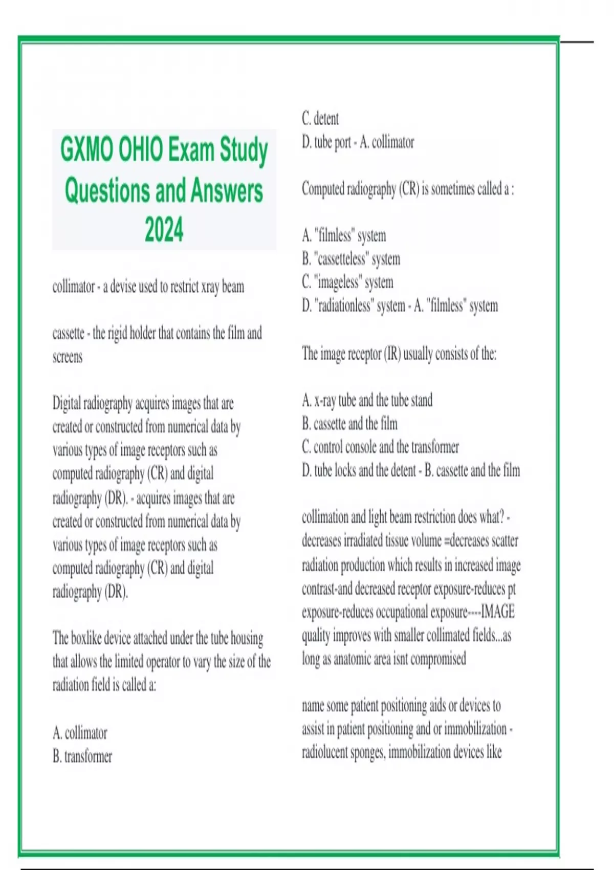 collimator - a devise used to restrict xray beam cassette - the rigid holder that contains the film and screens Digital radiography acquires images that are created or constructed from numerical data by various types of image receptors such as computed radiography (CR) and digital radiography (DR). - acquires images that are created or constructed from numerical data by various types of image receptors such as computed radiography (CR) and digital radiography (DR). The boxlike device attached under the tube housing that allows the limited operator to vary the size of the radiation field is called a: A. collimator B. transformer C. detent D. tube port - A. collimator Computed radiography (CR) is sometimes called a : A. "filmless" system B. "cassetteless" system C. "imageless" system D. "radiationless" system - A. "filmless" system