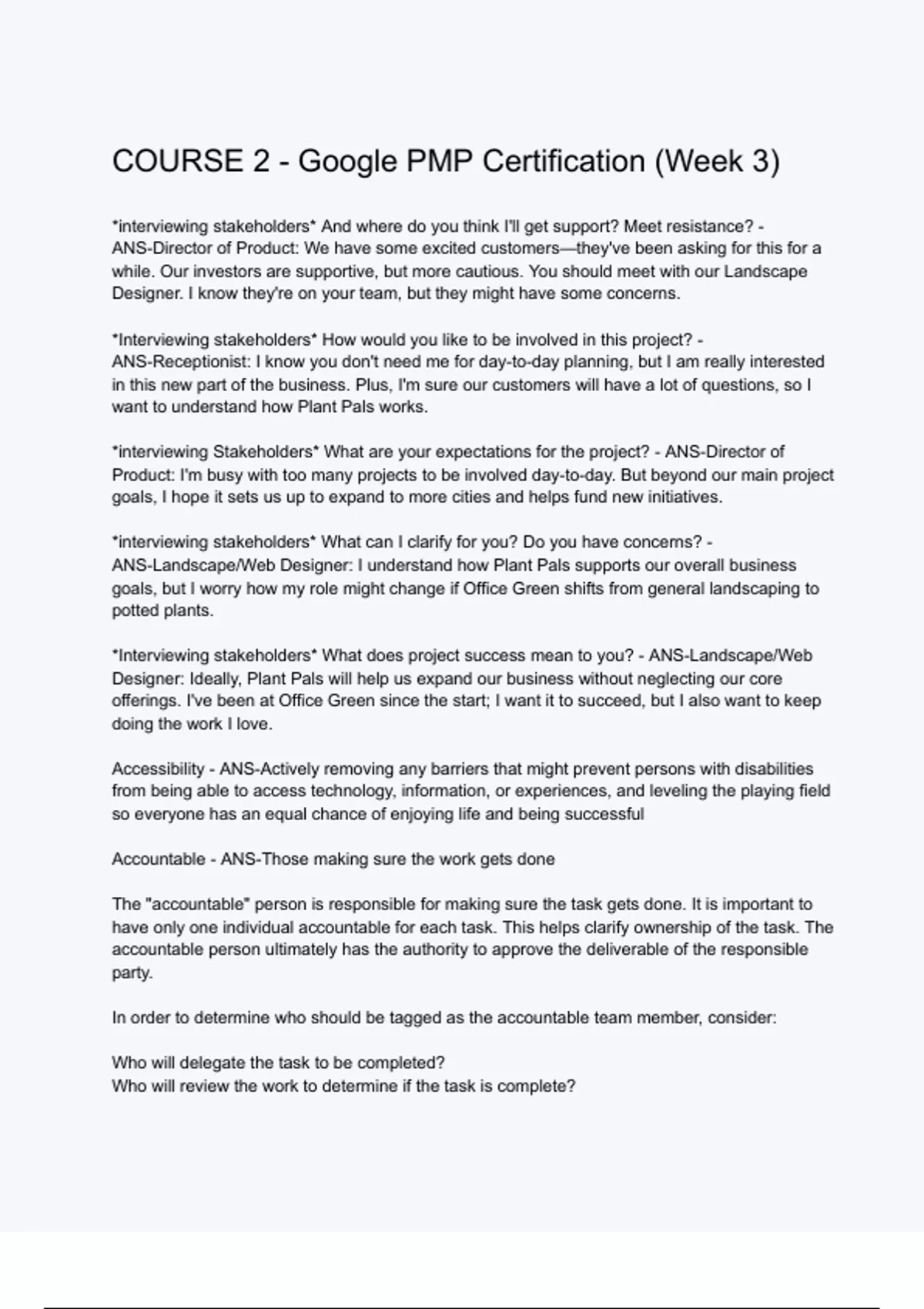 COURSE 2 - Google PMP Certification (Week 3) Exam elaborations questions and answers!