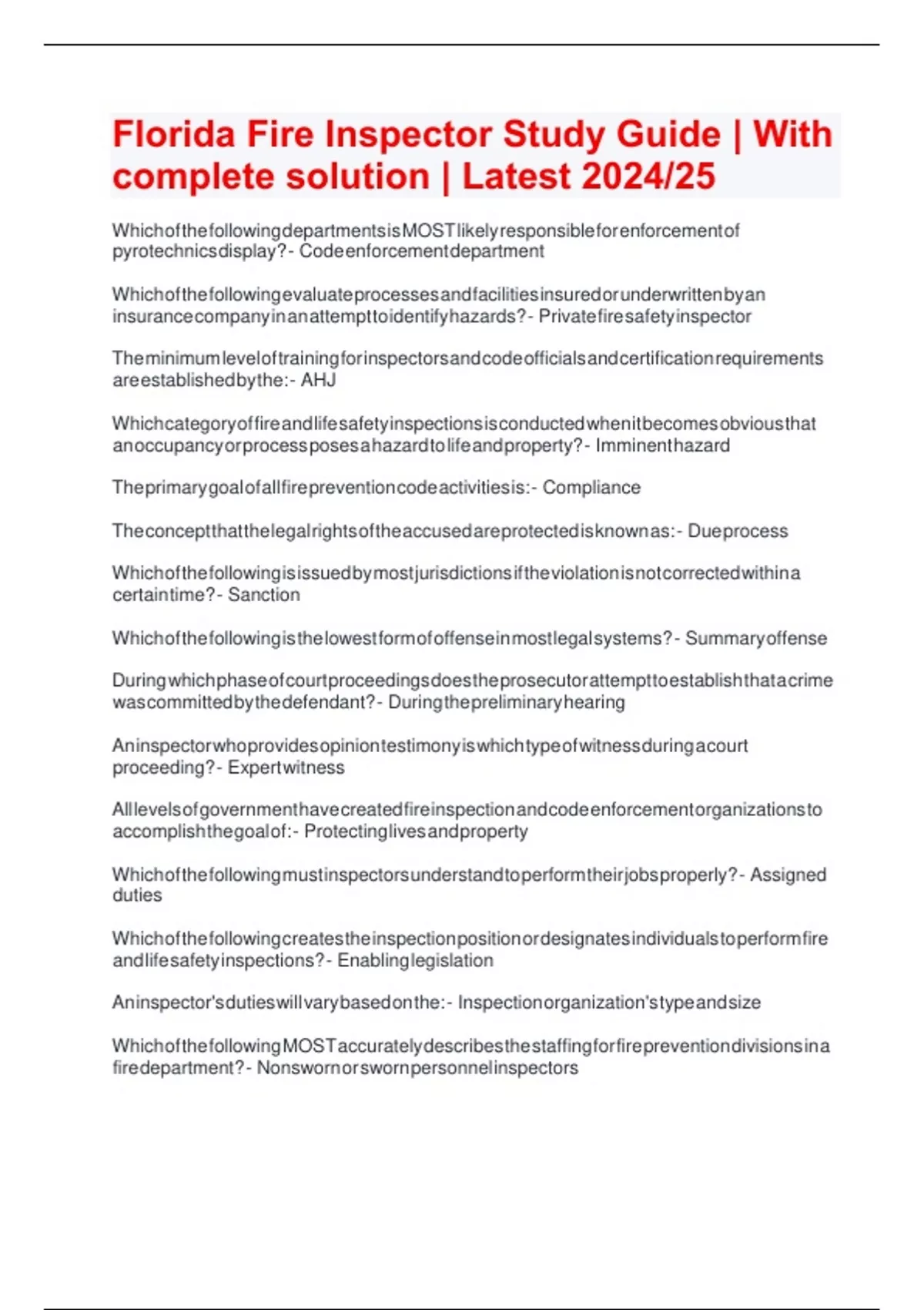 Florida Fire Inspector Study Guide | With complete solution | Latest 2024/25