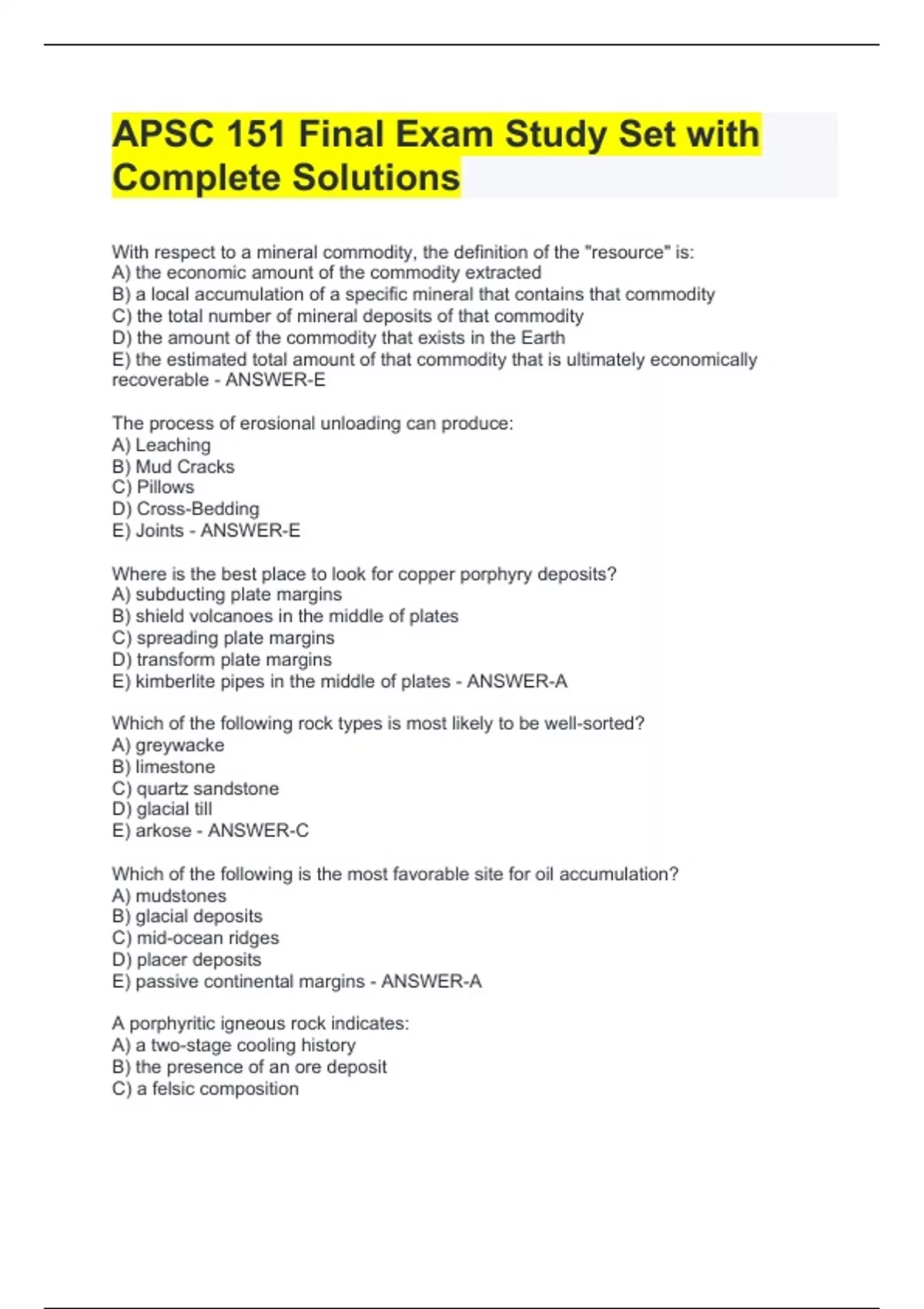 APSC 151 Final Exam Study Set with Complete SolutionsAPSC 151 Final Exam Study Set with Complete SolutionsAPSC 151 Final Exam Study Set with Complete SolutionsAPSC 151 Final Exam Study Set with Complete SolutionsAPSC 151 Final Exam Study Set with Complete Solutions With respect to a mineral commodity, the definition of the "resource" is: A) the economic amount of the commodity extracted B) a local accumulation of a specific mineral that contains that commodity C) the total number of mineral deposits of that commodity D) the amount of the commodity that exists in the Earth E) the estimated total amount of that commodity that is ultimately economically recoverable - ANSWER-E The process of erosional unloading can produce: A) Leaching B) Mud Cracks C) Pillows D) Cross-Bedding E) Joints - ANSWER-E Where is the best place to look for copper porphyry deposits?