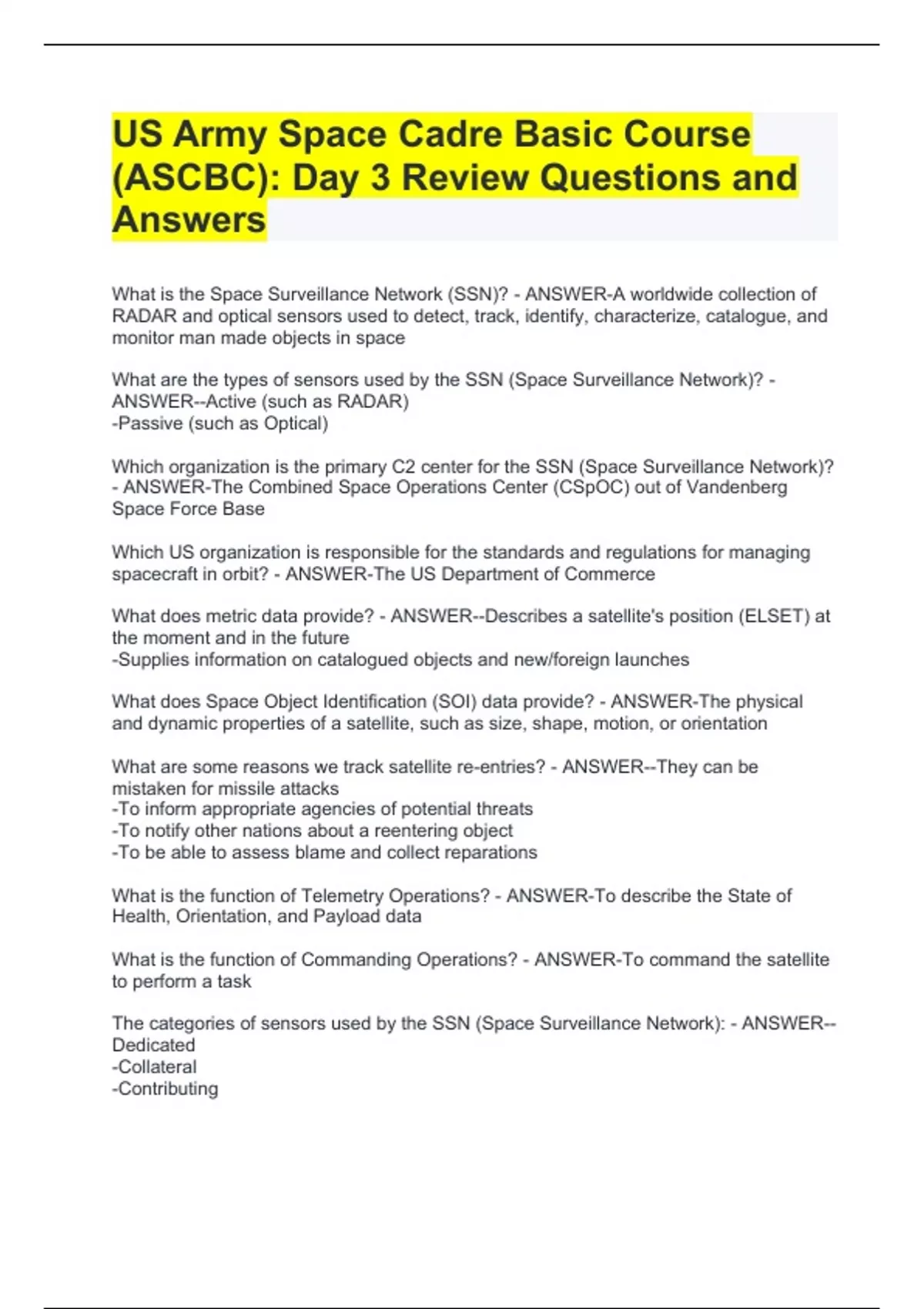 US Army Space Cadre Basic Course (ASCBC): Day 3 Review Questions and AnswersUS Army Space Cadre Basic Course (ASCBC): Day 3 Review Questions and AnswersUS Army Space Cadre Basic Course (ASCBC): Day 3 Review Questions and AnswersUS Army Space Cadre Basic Course (ASCBC): Day 3 Review Questions and Answers What is the Space Surveillance Network (SSN)? - ANSWER-A worldwide collection of RADAR and optical sensors used to detect, track, identify, characterize, catalogue, and monitor man made objects in space What are the types of sensors used by the SSN (Space Surveillance Network)? - ANSWER--Active (such as RADAR)
