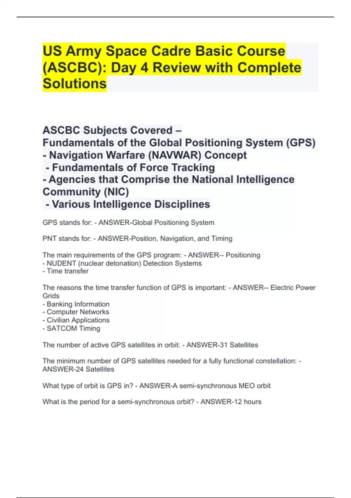 US Army Space Cadre Basic Course (ASCBC): Day 4 Review with Complete SolutionsUS Army Space Cadre Basic Course (ASCBC): Day 4 Review with Complete SolutionsUS Army Space Cadre Basic Course (ASCBC): Day 4 Review with Complete SolutionsUS Army Space Cadre Basic Course (ASCBC): Day 4 Review with Complete SolutionsGPS stands for: - ANSWER-Global Positioning System PNT stands for: - ANSWER-Position, Navigation, and Timing The main requirements of the GPS program: - ANSWER-- Positioning - NUDENT (nuclear detonation) Detection Systems - Time transfer