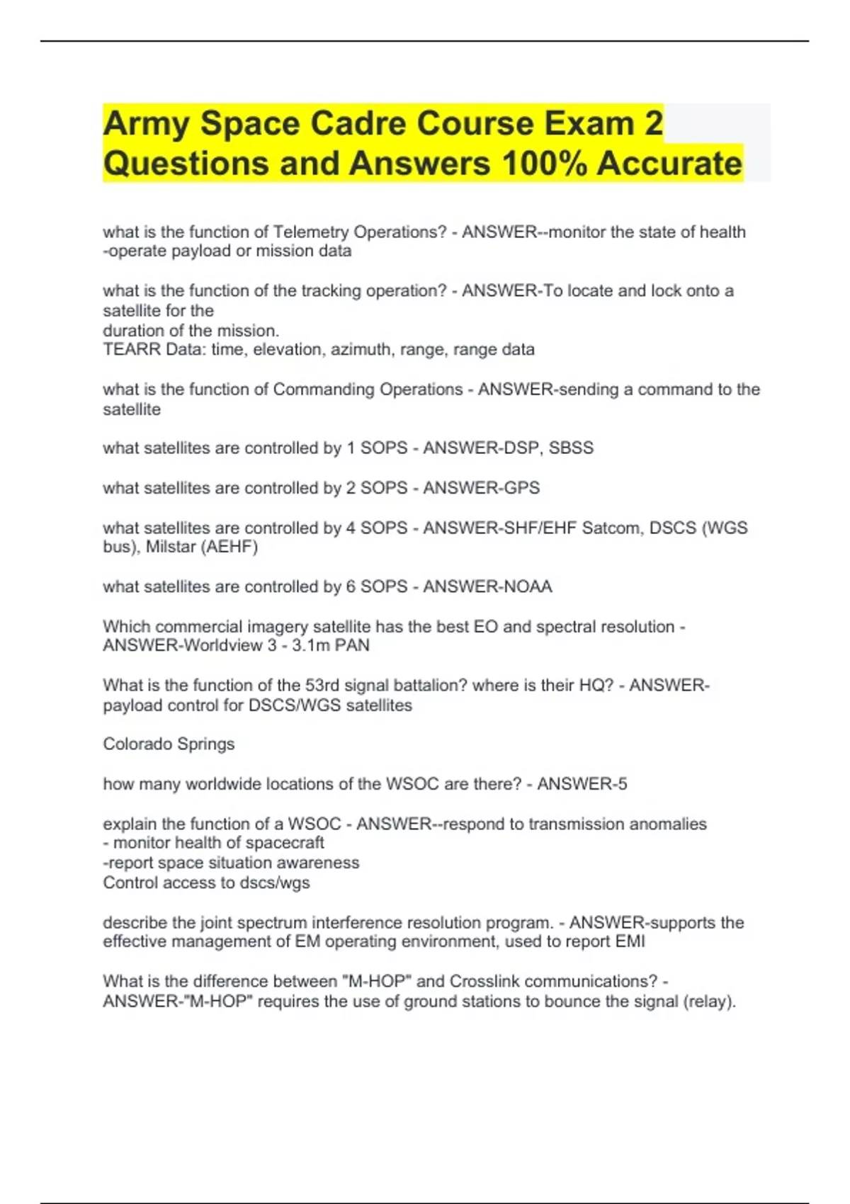 Army Space Cadre Course Exam 2 Questions and Answers 100% AccurateArmy Space Cadre Course Exam 2 Questions and Answers 100% AccurateArmy Space Cadre Course Exam 2 Questions and Answers 100% AccurateArmy Space Cadre Course Exam 2 Questions and Answers 100% Accurate what is the function of Telemetry Operations? - ANSWER--monitor the state of health -operate payload or mission data what is the function of the tracking operation? - ANSWER-To locate and lock onto a satellite for the duration of the mission. TEARR Data: time, elevation, azimuth, range, range data what is the function of Commanding Operations - ANSWER-sending a command to the satellite