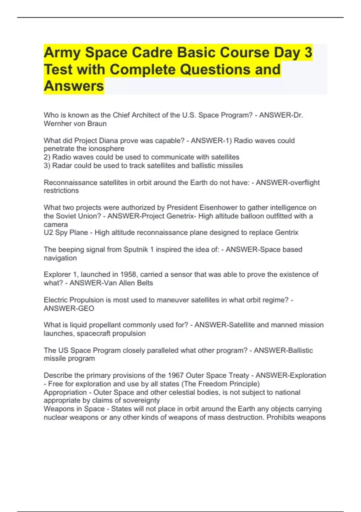 Army Space Cadre Basic Course Day 3 Test with Complete Questions and AnswersArmy Space Cadre Basic Course Day 3 Test with Complete Questions and AnswersArmy Space Cadre Basic Course Day 3 Test with Complete Questions and AnswersArmy Space Cadre Basic Course Day 3 Test with Complete Questions and Answers Who is known as the Chief Architect of the U.S. Space Program? - ANSWER-Dr. Wernher von Braun What did Project Diana prove was capable? - ANSWER-1) Radio waves could penetrate the ionosphere 2) Radio waves could be used to communicate with satellites 3) Radar could be used to track satellites and ballistic missiles Reconnaissance satellites in orbit around the Earth do not have: - ANSWER-overflight restrictions