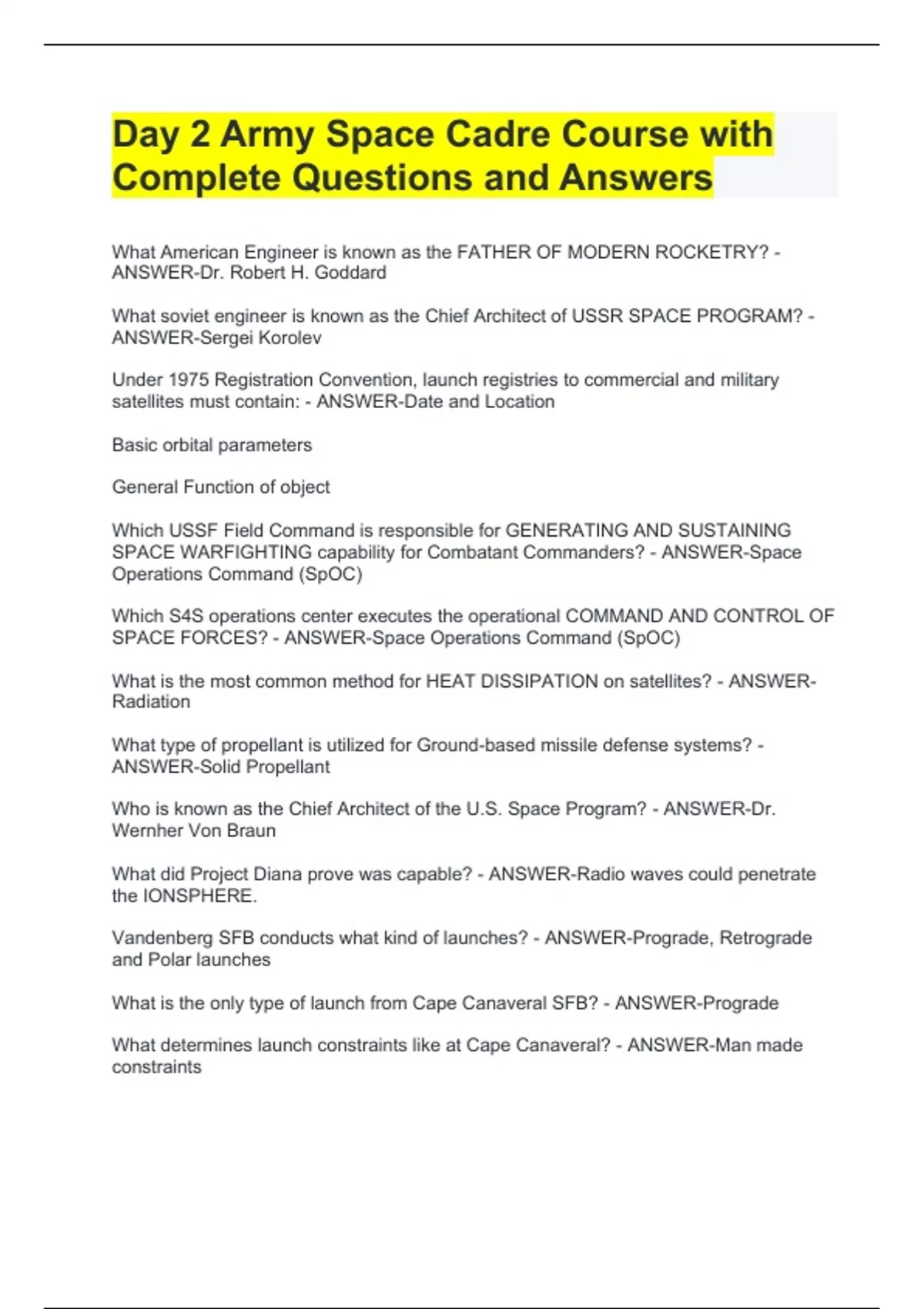 Day 2 Army Space Cadre Course with Complete Questions and AnswersDay 2 Army Space Cadre Course with Complete Questions and AnswersDay 2 Army Space Cadre Course with Complete Questions and AnswersDay 2 Army Space Cadre Course with Complete Questions and Answers What American Engineer is known as the FATHER OF MODERN ROCKETRY? - ANSWER-Dr. Robert H. Goddard What soviet engineer is known as the Chief Architect of USSR SPACE PROGRAM? - ANSWER-Sergei Korolev