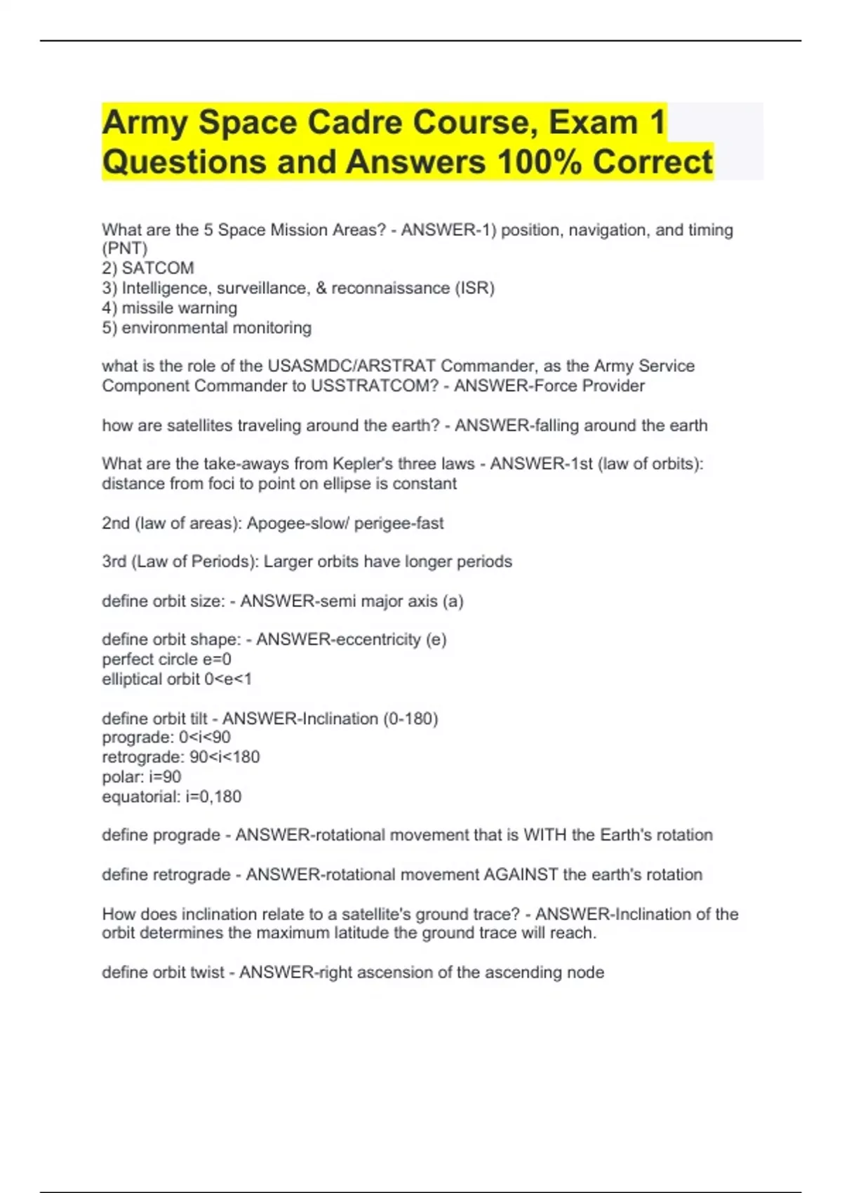 Army Space Cadre Course, Exam 1 Questions and Answers 100% Correct Army Space Cadre Course, Exam 1 Questions and Answers 100% CorrectArmy Space Cadre Course, Exam 1 Questions and Answers 100% CorrectArmy Space Cadre Course, Exam 1 Questions and Answers 100% Correct What are the 5 Space Mission Areas? - ANSWER-1) position, navigation, and timing (PNT) 2) SATCOM 3) Intelligence, surveillance, & reconnaissance (ISR) 4) missile warning 5) environmental monitoring what is the role of the USASMDC/ARSTRAT Commander, as the Army Service Component Commander to USSTRATCOM? - ANSWER-Force Provider