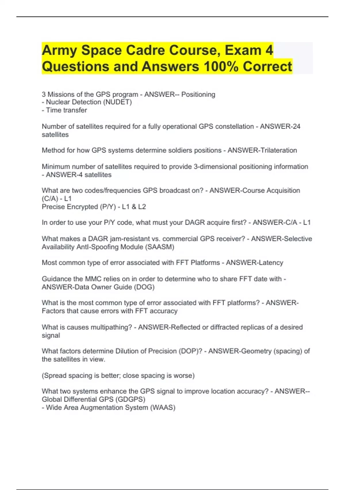 Army Space Cadre Course, Exam 4 Questions and Answers 100% CorrectArmy Space Cadre Course, Exam 4 Questions and Answers 100% CorrectArmy Space Cadre Course, Exam 4 Questions and Answers 100% CorrectArmy Space Cadre Course, Exam 4 Questions and Answers 100% Correct 3 Missions of the GPS program - ANSWER-- Positioning - Nuclear Detection (NUDET) - Time transfer Number of satellites required for a fully operational GPS constellation - ANSWER-24 satellites Method for how GPS systems determine soldiers positions - ANSWER-Trilateration Minimum number of satellites required to provide 3-dimensional positioning information - ANSWER-4 satellites