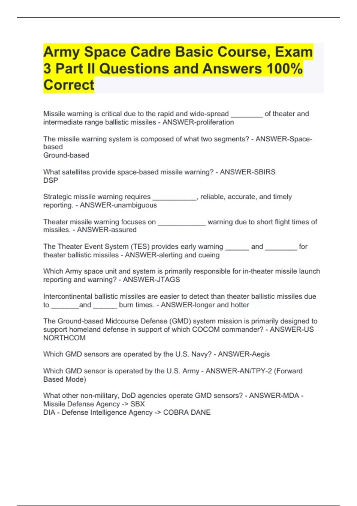 Army Space Cadre Basic Course, Exam 3 Part II Questions and Answers 100% CorrectArmy Space Cadre Basic Course, Exam 3 Part II Questions and Answers 100% CorrectArmy Space Cadre Basic Course, Exam 3 Part II Questions and Answers 100% CorrectArmy Space Cadre Basic Course, Exam 3 Part II Questions and Answers 100% CorrectMissile warning is critical due to the rapid and wide-spread ________ of theater and intermediate range ballistic missiles - ANSWER-proliferation The missile warning system is composed of what two segments? - ANSWER-Space-based Ground-based