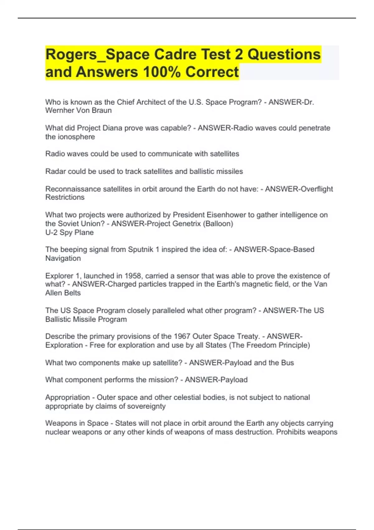 Rogers_Space Cadre Test 2 Questions and Answers 100% CorrectRogers_Space Cadre Test 2 Questions and Answers 100% CorrectRogers_Space Cadre Test 2 Questions and Answers 100% CorrectRogers_Space Cadre Test 2 Questions and Answers 100% Correct Who is known as the Chief Architect of the U.S. Space Program? - ANSWER-Dr. Wernher Von Braun What did Project Diana prove was capable? - ANSWER-Radio waves could penetrate the ionosphere Radio waves could be used to communicate with satellites