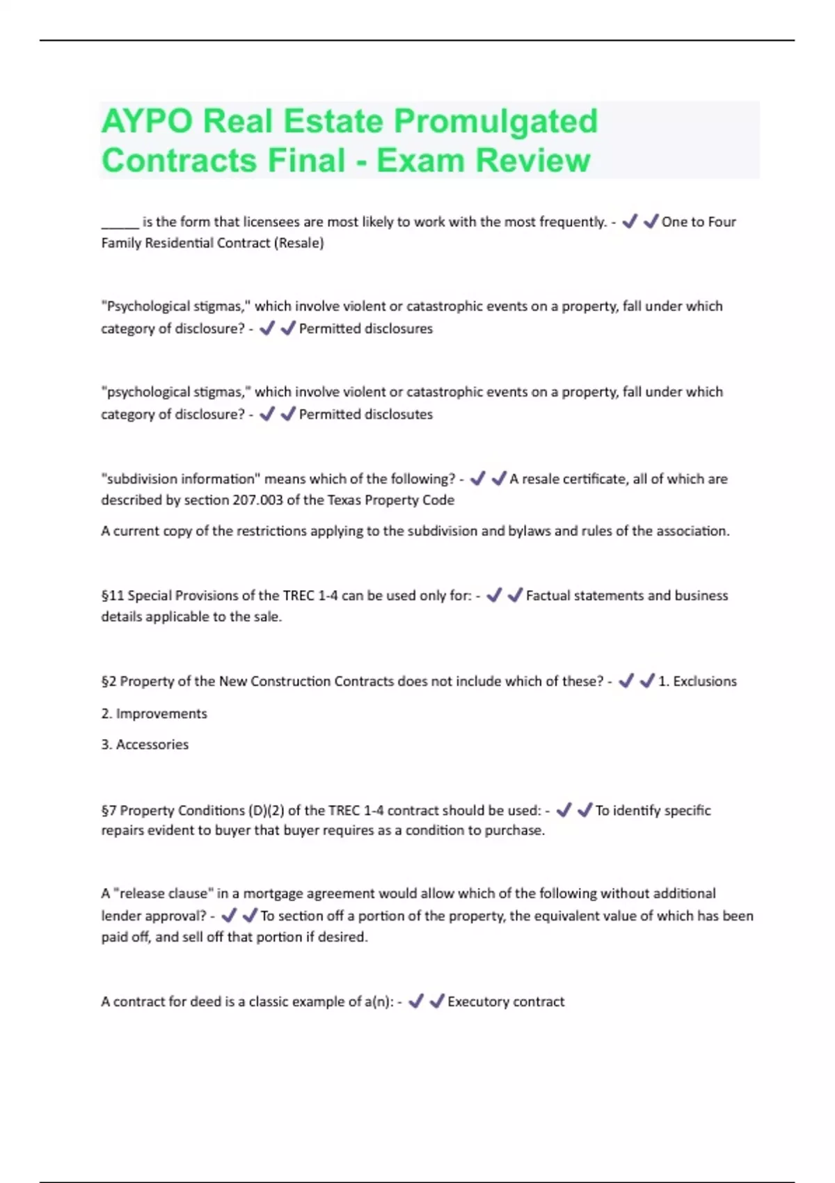 AYPO Real Estate Promulgated Contracts Final - Exam Review Questions + Answers Graded A+
