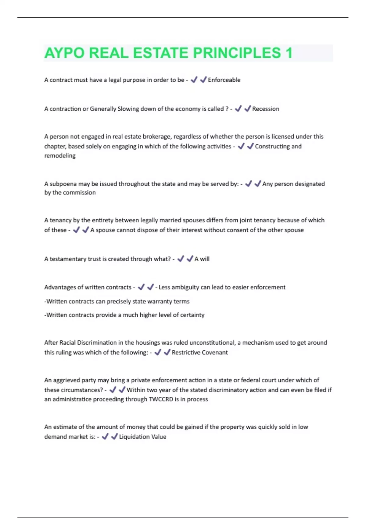 AYPO REAL ESTATE PRINCIPLES 1 EXAM PACKAGE DEAL WITH COMPLETE SOLUTIONS.