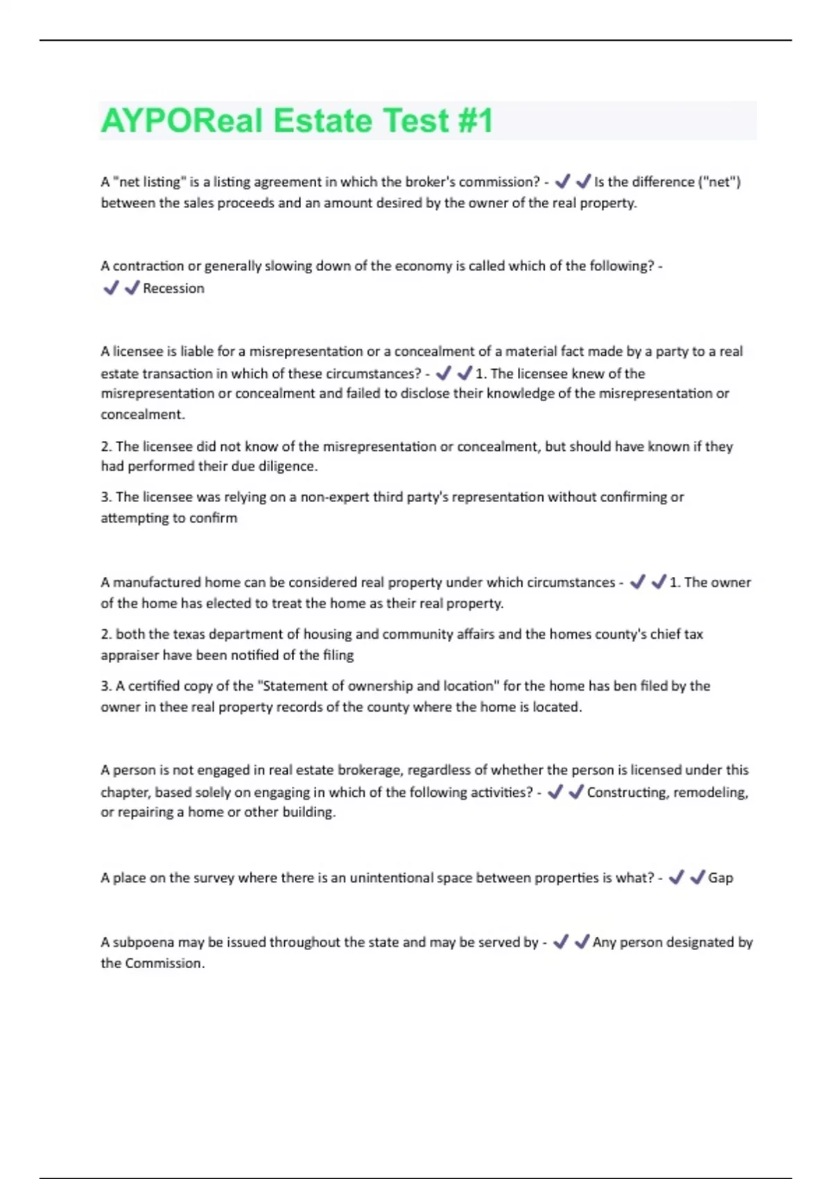 AYPOReal Estate Test #1 Questions + Answers Graded A+