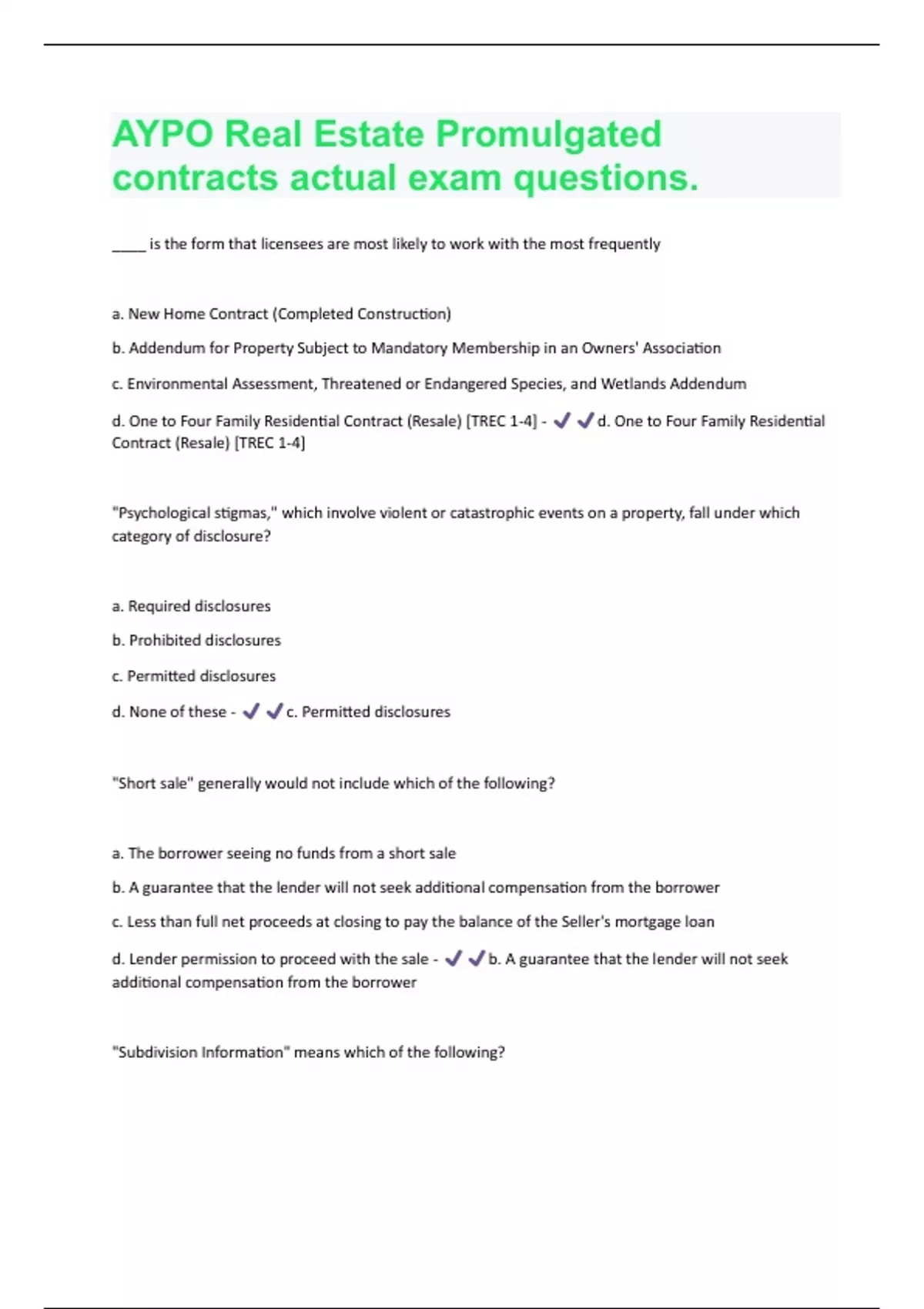 AYPO Real Estate Promulgated contracts actual exam Questions With 100 % Correct Answers | latest