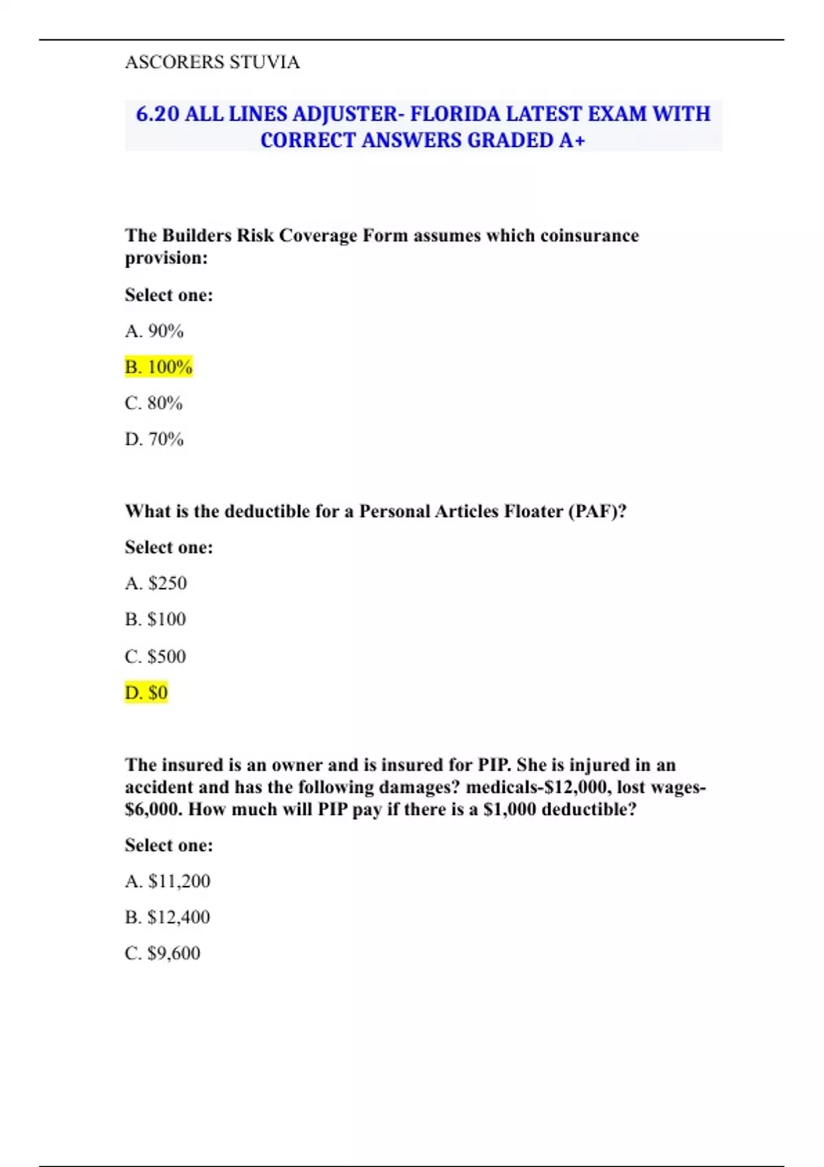 6.20 ALL LINES ADJUSTER- FLORIDA LATEST EXAM WITH CORRECT ANSWERS GRADED A+