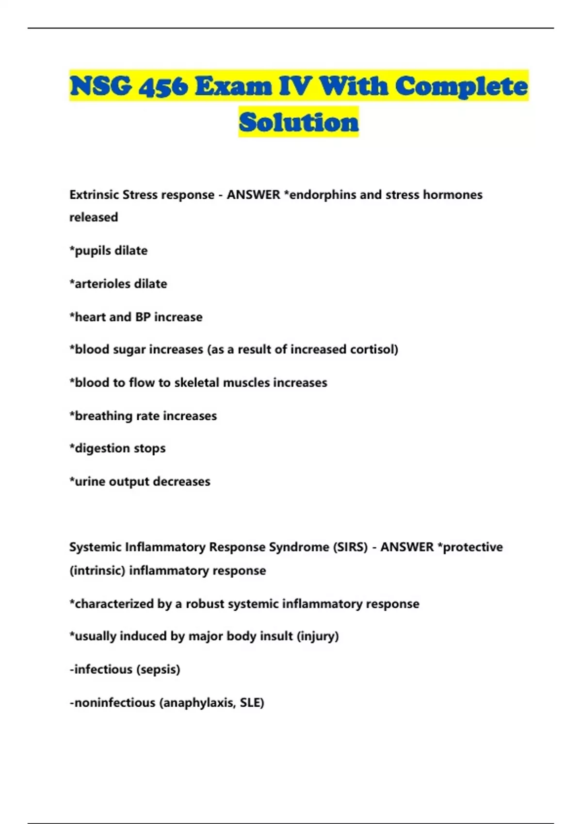 NSG 456 Exam IV With C omp lete Solution Extrinsic Stress response - ANSWER *endorphins and stress hormones released *pupils dilate *arterioles dilate *heart and BP increase *blood sugar increases (as a result of increased cortisol) *blood to flow to skeletal muscles increases *breathing rate increases *digestion stops *urine output decreases Systemic Inflammatory Response Syndrome (SIRS) - ANSWER *protective (intrinsic) inflammatory response *characterized by a robust systemic inflammatory response *usually induced by major body insult (injury) -infectious (sepsis) -noninfectious (anaphylaxis, SLE) Criteria to Identify SIRS - ANSWER two or more of the following *temp >101 or <96.8 *tachycardia (HR >90) *tachypnea (RR >20 or PaCO2 <32 mmHg) *WBC count ->12k cells -<4000 cells >10% immature WBC (aka "bands", neutrophils) NOT HELPFUL IN DIAGNOSIS SEPSIS Shock definition - ANSWER a clinical syndrome that results from inadequate tissue perfusion, creating an imbalance between the delivery of oxygen and nutrients needed to support cellular function Shock - ANSWER *shock is initially reversible, but must be recognized and treated immediately to prevent irreversible organ dysfunction *all body systems are affected *hypoperfusion of the tissues *hypermetabolism *SIRS Does shock mean low blood pressure? - ANSWER It can depend on the type of shock. Most shock is hypotensive, but it can be hypertensive (cardiogenic). Steps of Shock - ANSWER 1. Inadequate perfusion - not enough oxygen gets to cells 2. Cells forced to switch to anaerobic respiration 3. Lactic acid builds up -> metabolic acidosis 4. Vasoconstriction -> venous pooling 5. endothelial damage -cell membrane dysfunction and loss of sodium-potassium pump -decrease in vascular oncotic pressure -increased 3rd spacing from intravascular space -efflux of potassium -influx of sodium and water many organ cells die = ORGAN DEATH Compensatory Mechanisms of Shock - ANSWER Clinical Findings in Stages of Shock - ANSWER Compensatory Stage of Shock - ANSWER *SNS stimulation *body shunts blood to only core organs *tissue perfusion becomes inadequate *acidosis occurs due to anaerobic metabolism *RR increases due to acidosis *confusion may occur Progressive Stage of Shock - ANSWER *BP and MAP decrease *all organs suffer from hypoperfusion *vasoconstriction continues *mental status further deteriorate s *decrease in pulmonary blood flow causes further hypoxemia *inadequate perfusion of heart leads to dysrhythmias and ischemia *MAP falls below 70 *GFR cannot be maintained *function of liver, GI, and blood all impaired *disseminated intravascular coagulation (DIC) may occur as cause or complication of shock