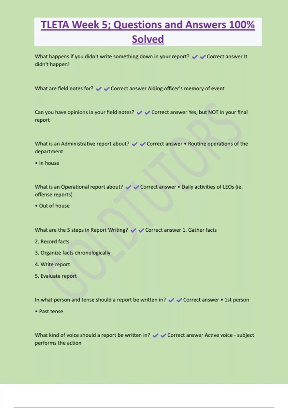 TLETA Week 5; Questions and Answers 100% Solved What happens if you didn't write something down in your report? Correct answer It didn't happen! What are field notes for? Correct answer Aiding officer's memory of event Can you have opinions in your field notes? Correct answer Yes, but NOT in your final report What is an Administrative report about? Correct answer • Routine operations of the department • In house