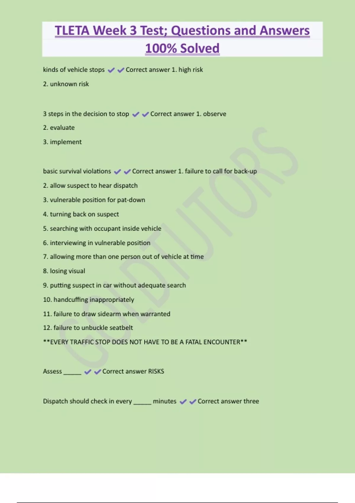 TLETA Week 3 Test; Questions and Answers 100% Solved kinds of vehicle stops Correct answer 1. high risk 2. unknown risk 3 steps in the decision to stop Correct answer 1. observe 2. evaluate 3. implement basic survival violations Correct answer 1. failure