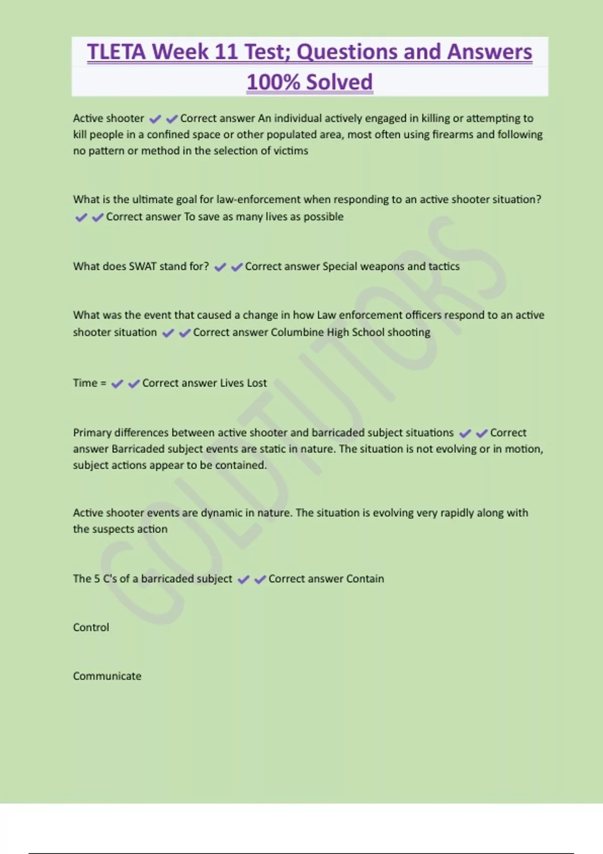 TLETA Week 11 Test; Questions and Answers 100% Solved Active shooter Correct answer An individual actively engaged in killing or attempting to kill people in a confined space or other populated area, most often using firearms and following no pattern or method in the selection of victims What is the ultimate goal for law-enforcement when responding to an active shooter situation? Correct answer To save as many lives as possible What does SWAT stand for? Correct answer Special weapons and tactics What was the event that caused a change in how Law enforcement officers respond to an active shooter situation Correct answer Columbine High School shooting