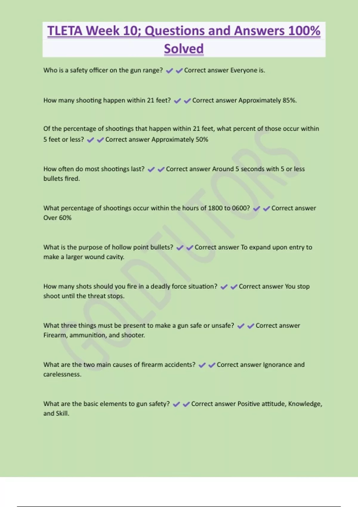 TLETA Week 10; Questions and Answers 100% Solved Who is a safety officer on the gun range? Correct answer Everyone is. How many shooting happen within 21 feet? Correct answer Approximately 85%. Of the percentage of shootings that happen within 21 feet, what percent of those occur within 5 feet or less? Correct answer Approximately 50% How often do most shootings last? Correct answer Around 5 seconds with 5 or less bullets fired. What percentage of shootings occur within the hours of 1800 to 0600? Correct answer Over 60%