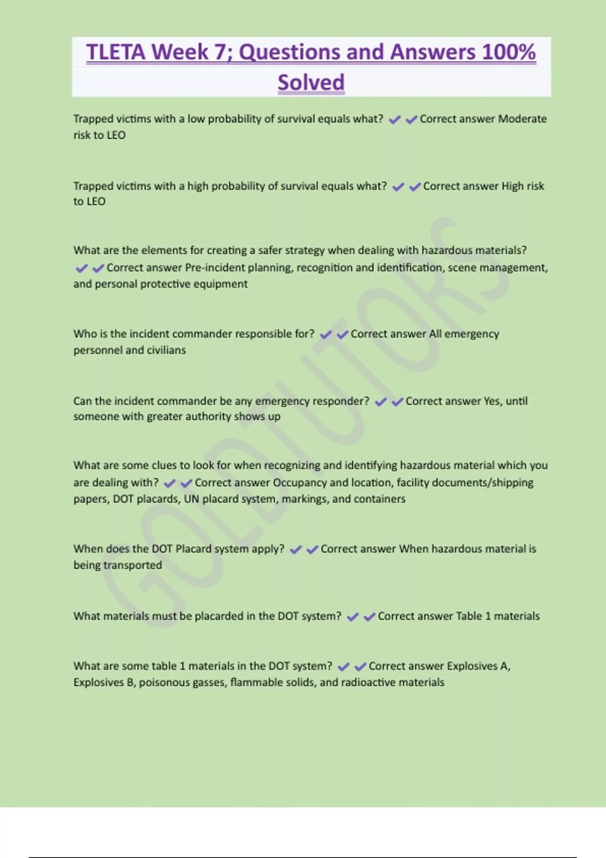 TLETA Week 7; Questions and Answers 100% Solved Trapped victims with a low probability of survival equals what? Correct answer Moderate risk to LEO Trapped victims with a high probability of survival equals what? Correct answer High risk to LEO What are the elements for creating a safer strategy when dealing with hazardous materials? Correct answer Pre-incident planning, recognition and identification, scene management, and personal protective equipment Who is the incident commander responsible for? Correct answer All emergency personnel and civilians