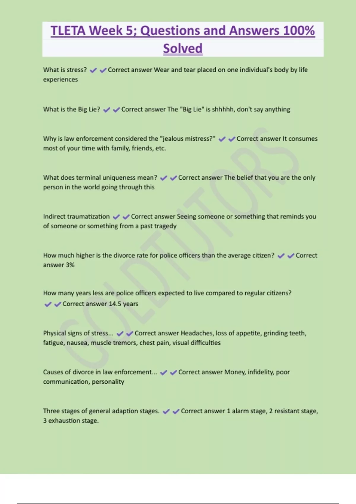 TLETA Week 5; Questions and Answers 100% Solved What is stress? Correct answer Wear and tear placed on one individual's body by life experiences What is the Big Lie? Correct answer The "Big Lie" is shhhhh, don't say anything Why is law enforcement considered the "jealous mistress?" Correct answer It consumes most of your time with family, friends, etc. What does terminal uniqueness mean? Correct answer The belief that you are the only person in the world going through this