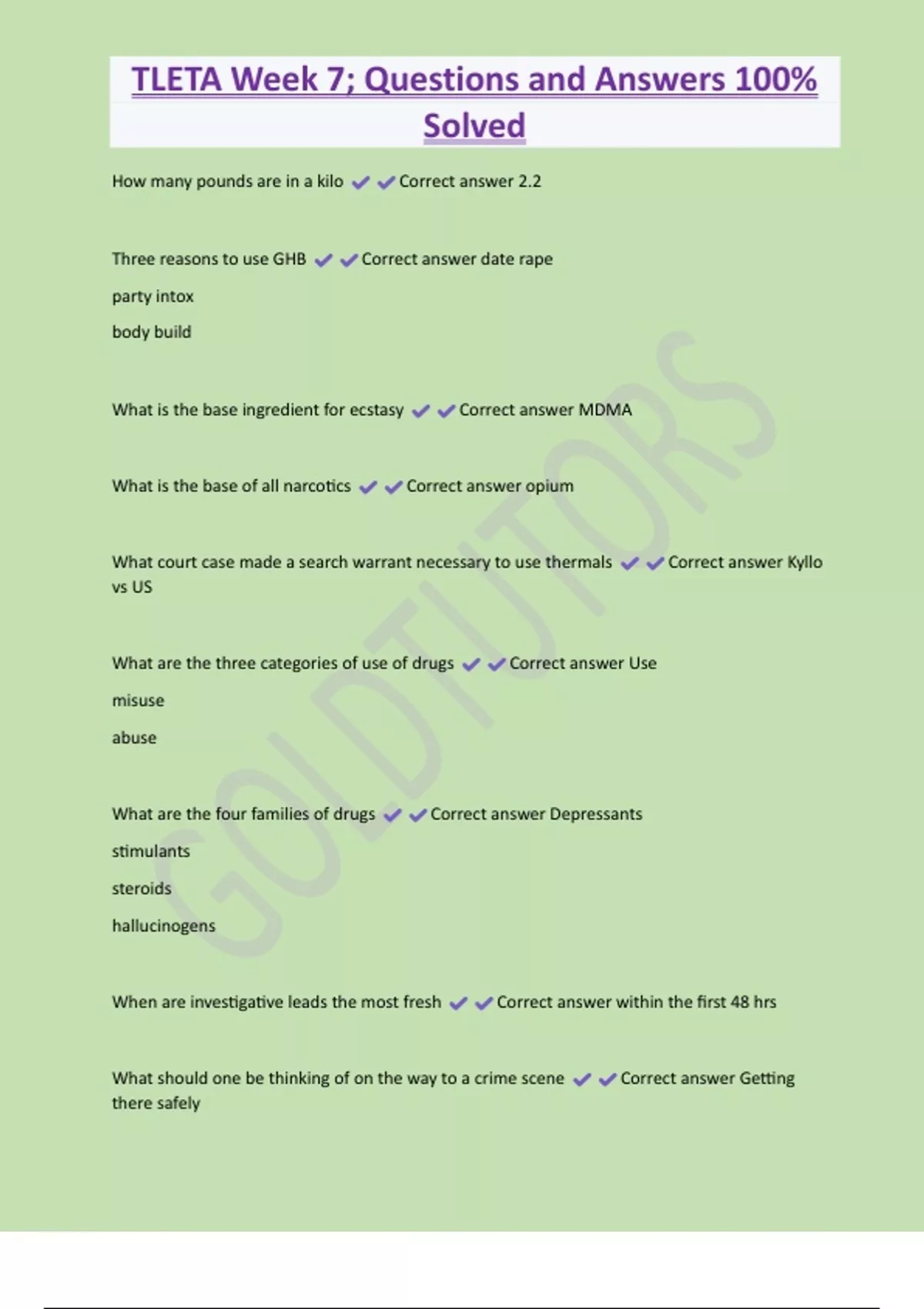 TLETA Week 7; Questions and Answers 100% Solved How many pounds are in a kilo Correct answer 2.2 Three reasons to use GHB Correct answer date rape party intox body build What is the base ingredient for ecstasy Correct answer MDMA What is the base of all narcotics Correct answer opium