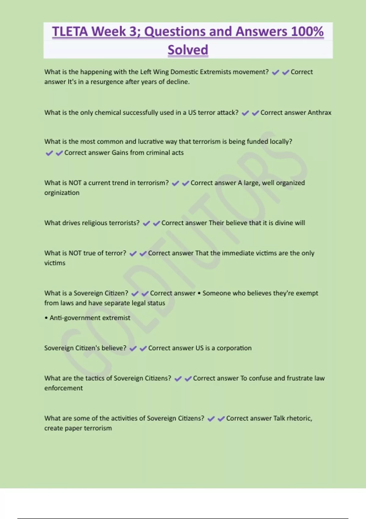 TLETA Week 3; Questions and Answers 100% Solved What is the happening with the Left Wing Domestic Extremists movement? Correct answer It's in a resurgence after years of decline. What is the only chemical successfully used in a US terror attack? Correct answer Anthrax What is the most common and lucrative way that terrorism is being funded locally? Correct answer Gains from criminal acts What is NOT a current trend in terrorism? Correct answer A large, well organized orginization What drives religious terrorists? Correct answer Their believe that it is divine will What is NOT true of terror? Correct answer That the immediate victims are the only victims