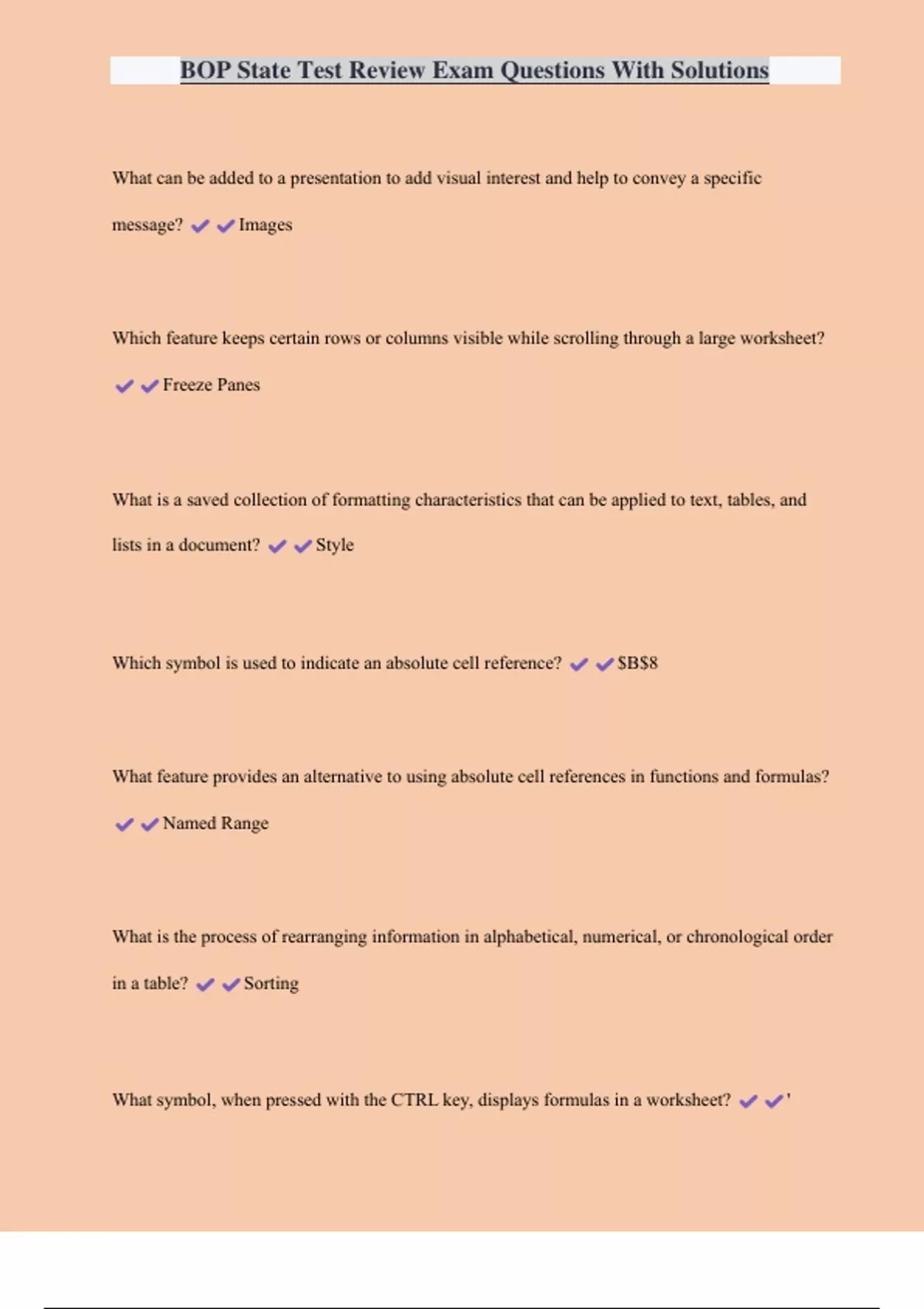 BOP State Test Review Exam Questions With Solutions What can be added to a presentation to add visual interest and help to convey a specific message? Images Which feature keeps certain rows or columns visible while scrolling through a large worksheet? Freeze Panes What is a saved collection of formatting characteristics that can be applied to text, tables, and lists in a document? Style Which symbol is used to indicate an absolute cell reference? $B$8 What feature provides an alternative to using absolute cell references in functions and formulas? Named Range
