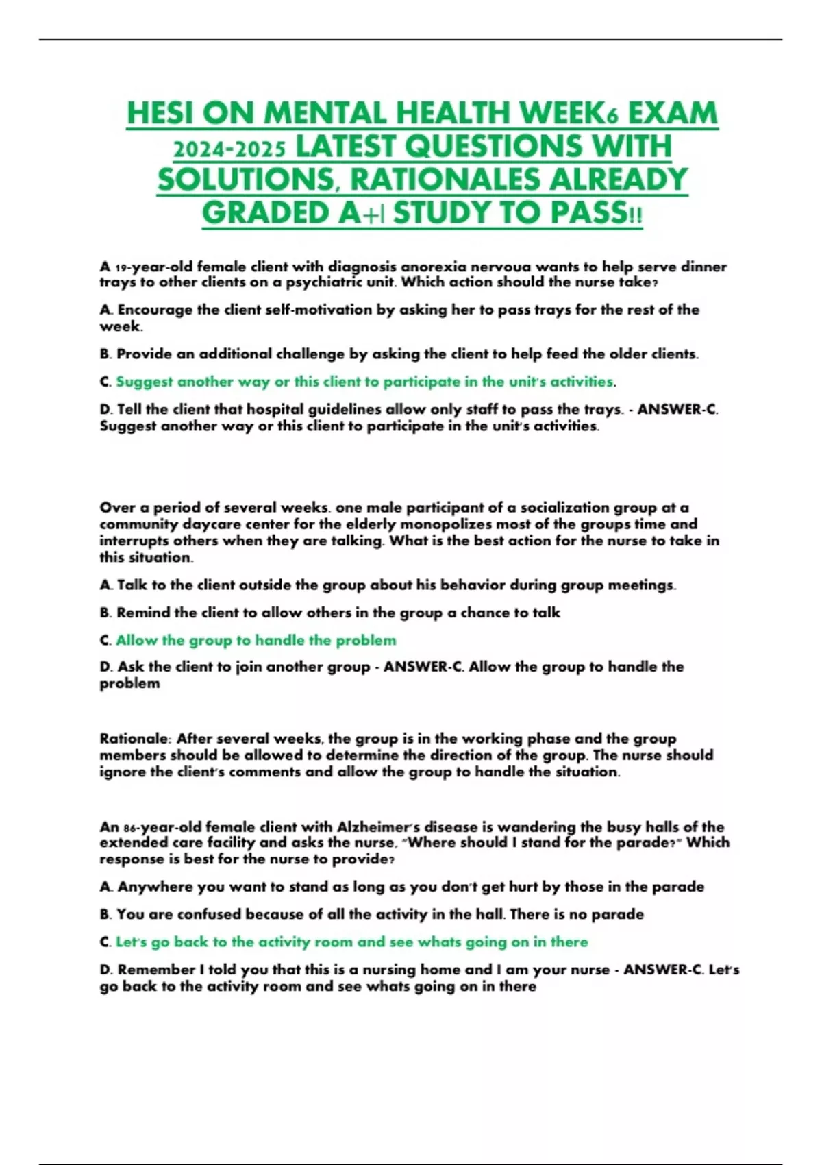 HESI ON MENTAL HEALTH WEEK6 EXAM LATEST QUESTIONS WITH SOLUTIONS, RATIONALES ALREADY GRADED A+| STUDY TO PASS!!