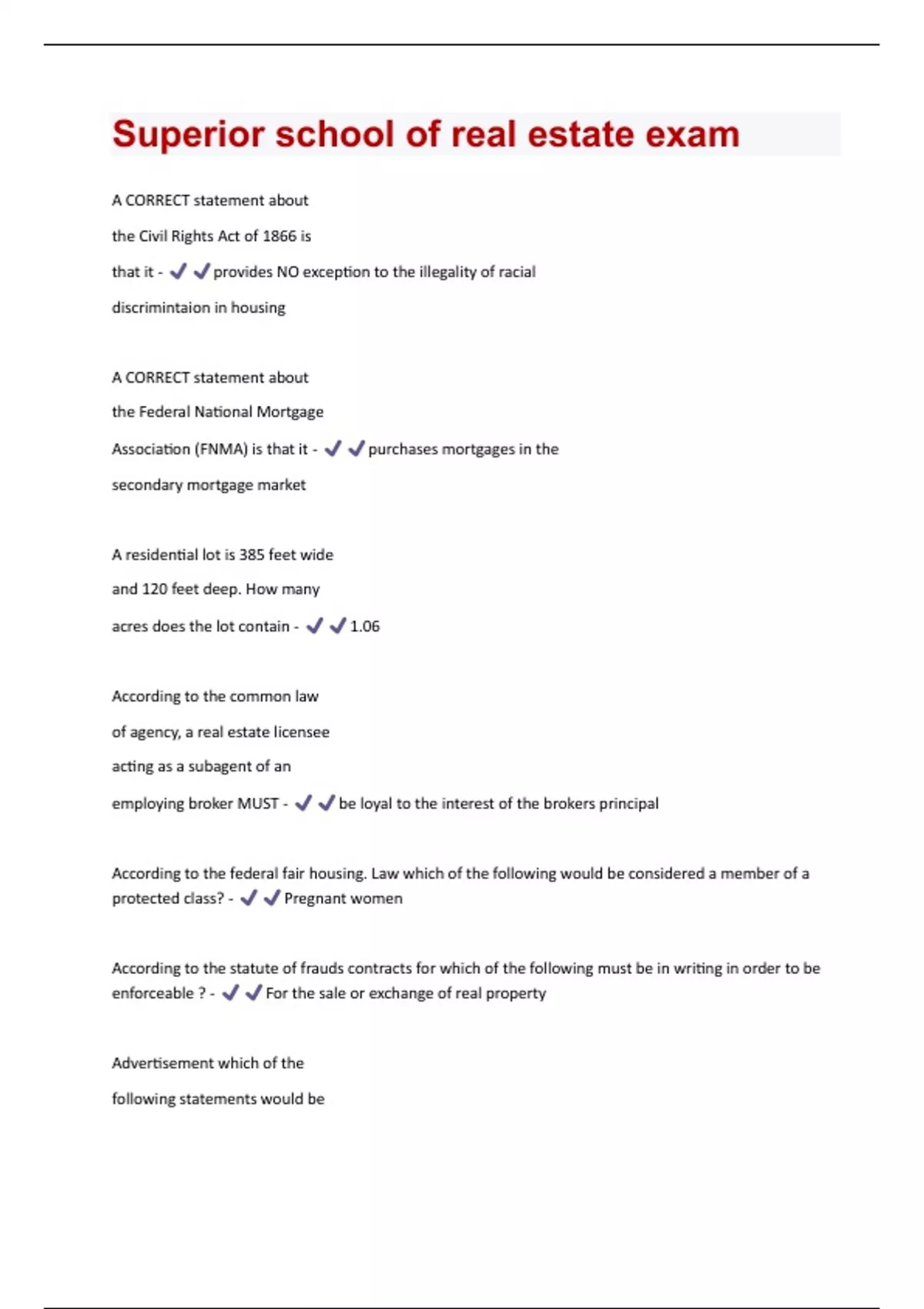 Superior school of real estate exam Questions & Answers Solved 100% Correct!!