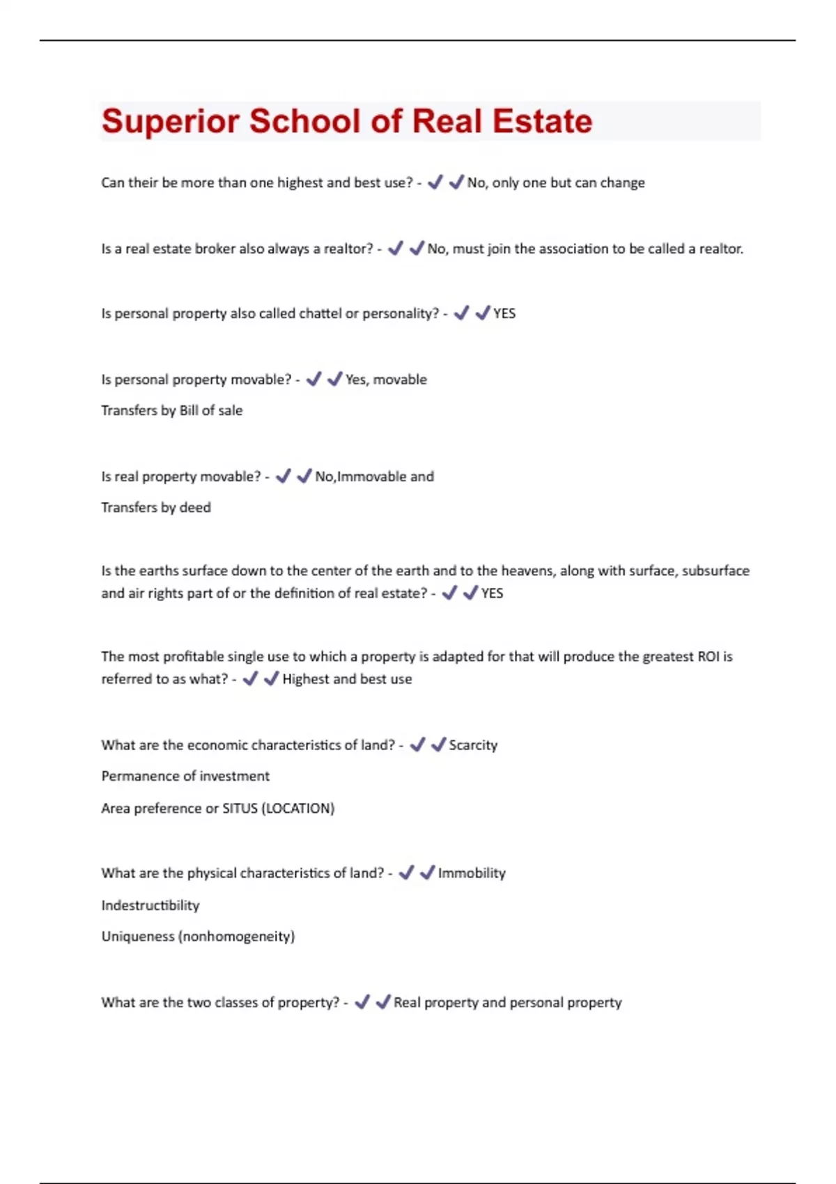 Can their be more than one highest and best use? - No, only one but can change Is a real estate broker also always a realtor? - No, must join the association to be called a realtor. Is personal property also called chattel or personality? - YES Is personal property movable? - Yes, movable Transfers by Bill of sale Is real property movable? - No,Immovable and Transfers by deed Is the earths surface down to the center of the earth and to the heavens, along with surface, subsurface and air rights part of or the definition of real estate? - YES The most profitable single use to which a property is adapted for that will produce the greatest ROI is referred to as what? - Highest and best use What are the economic characteristics of land? - Scarcity Permanence of investment Area preference or SITUS (LOCATION) What are the physical characteristics of land? - Immobility Indestructibility Uniqueness (nonhomogeneity) What are the two classes of property? - Real property and personal propertyWhat is the land and everything permanently attached to it called? - Real property What type of property is referred to as everything else? - Personal property